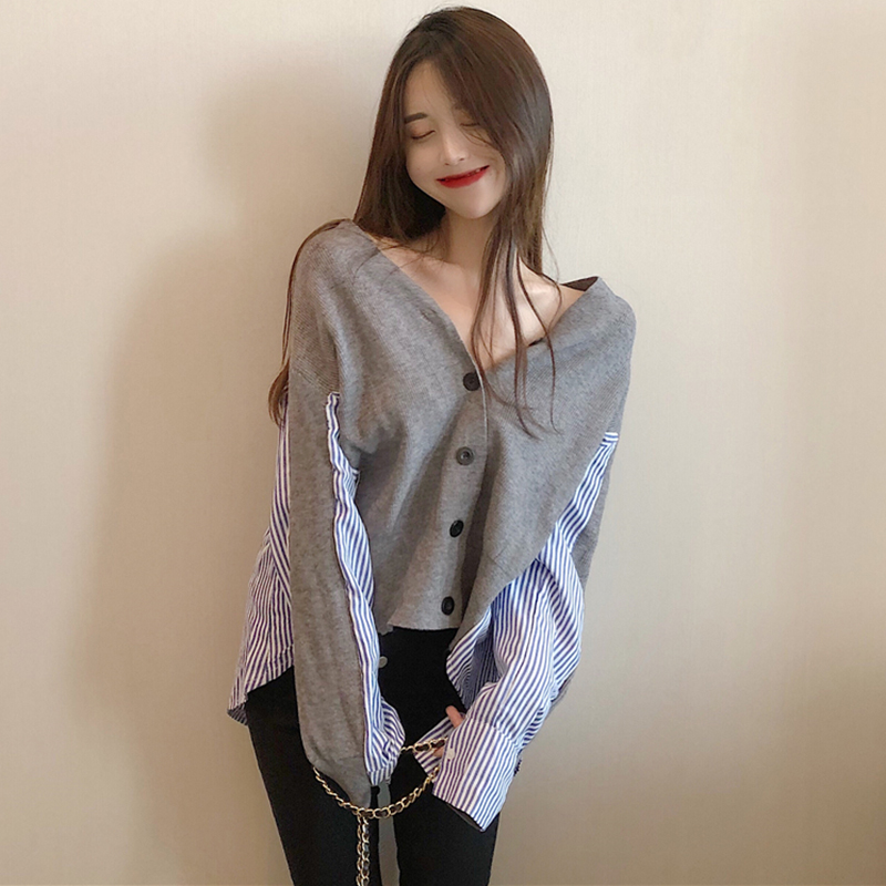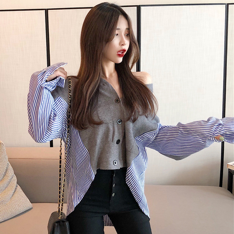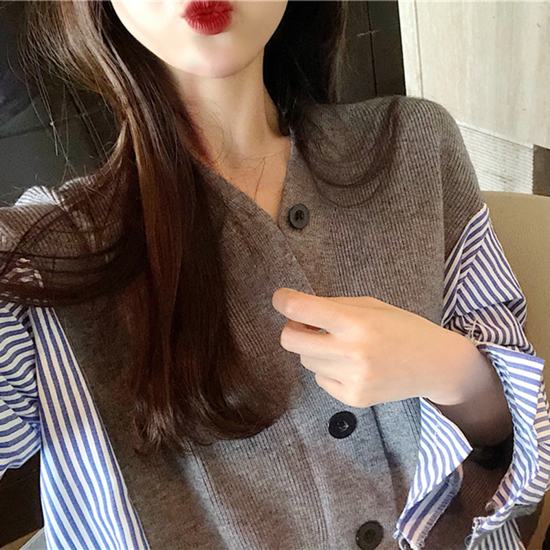 / 時尚條紋拼接假兩件長袖襯衫女秋冬裝新款針織開衫外套休閑上衣潮