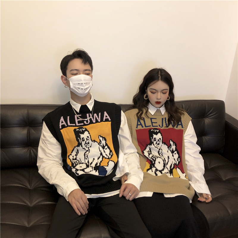 / 秋冬韓版慵懶風寬松卡通無袖針織衫毛衣馬甲背心外套+打底襯衫女