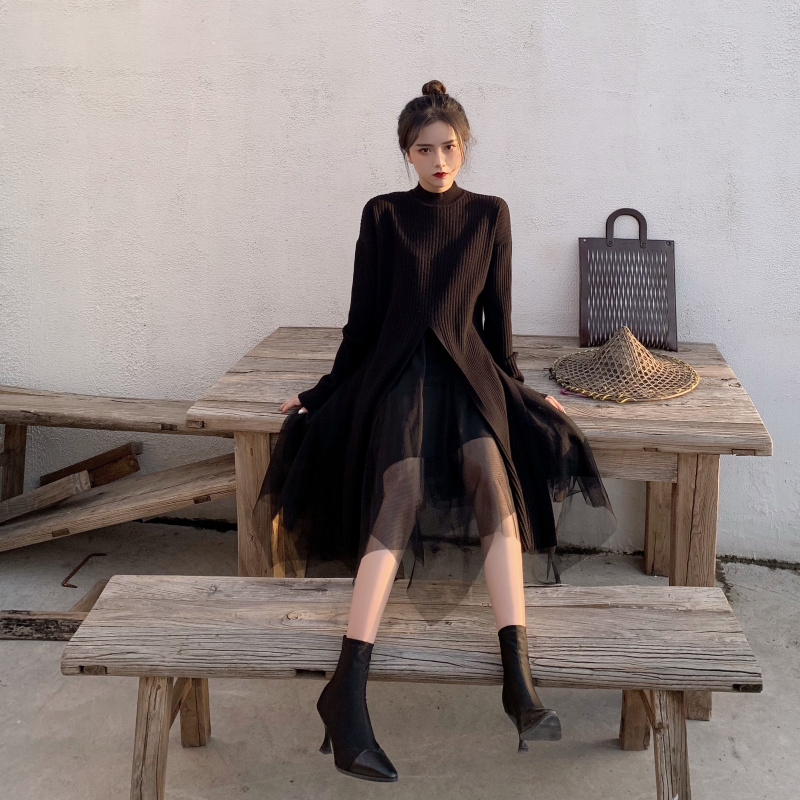 秋冬季時尚黑色修身套頭毛衣女2018新款+高腰網紗半身裙兩件套裝