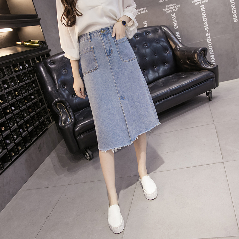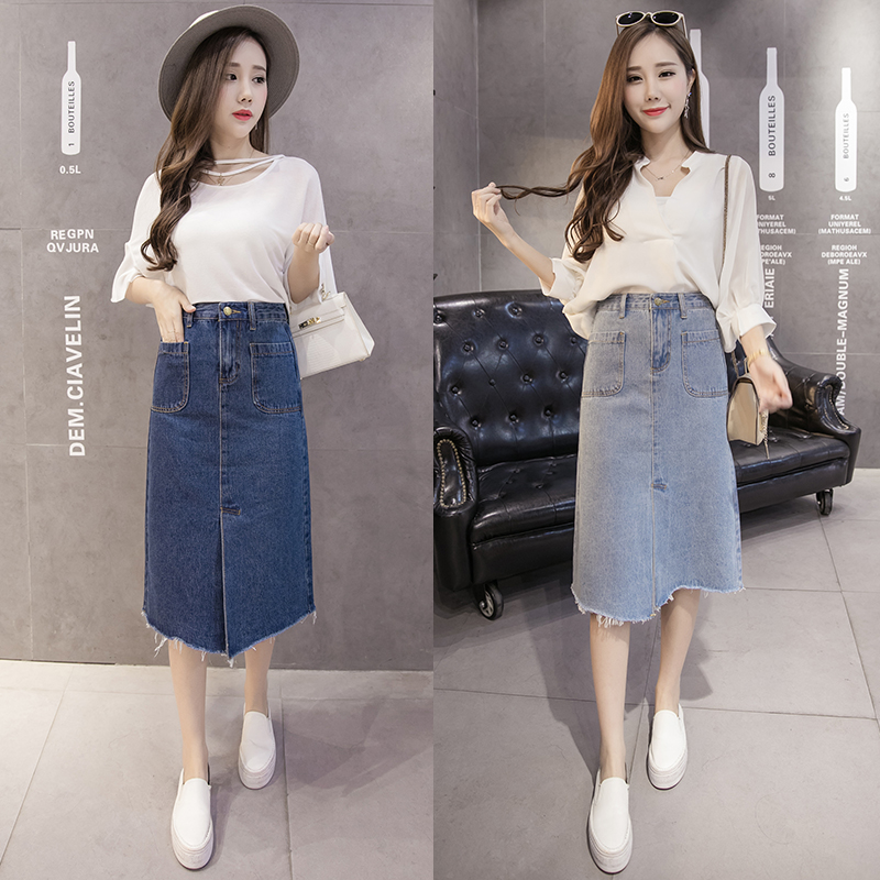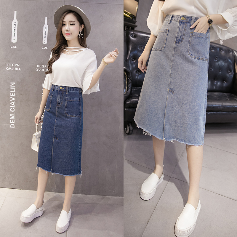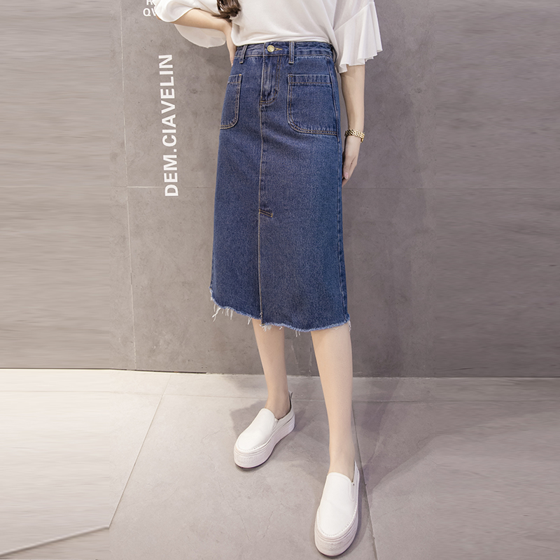 / 春夏牛仔裙中長款長裙毛邊高腰百搭半身裙女單排扣a字包臀裙