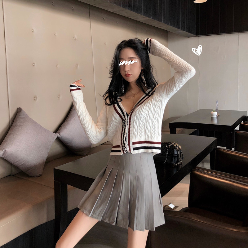 新款chic時尚套裝秋冬學院風減齡少女修身針織開衫短裙百搭兩件套