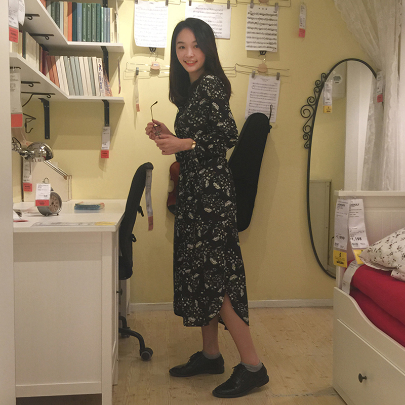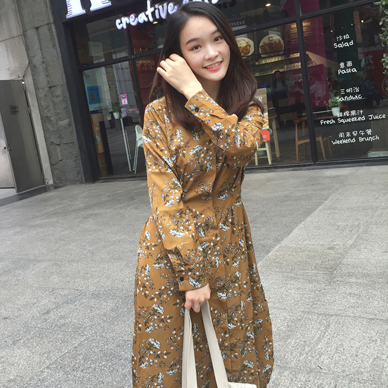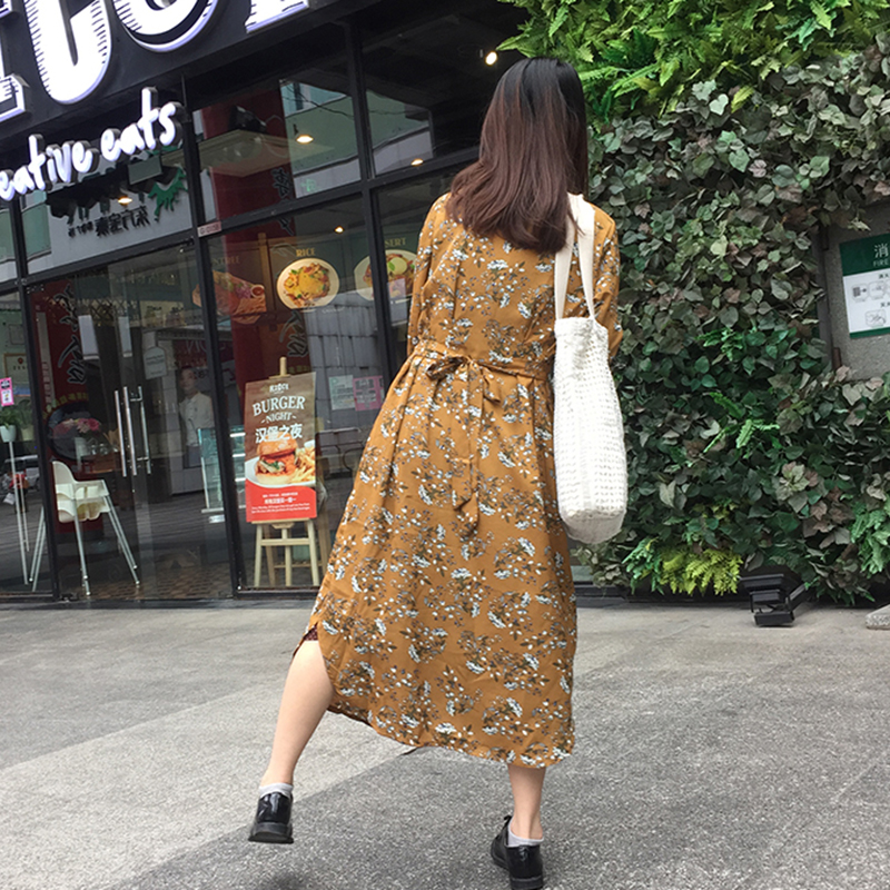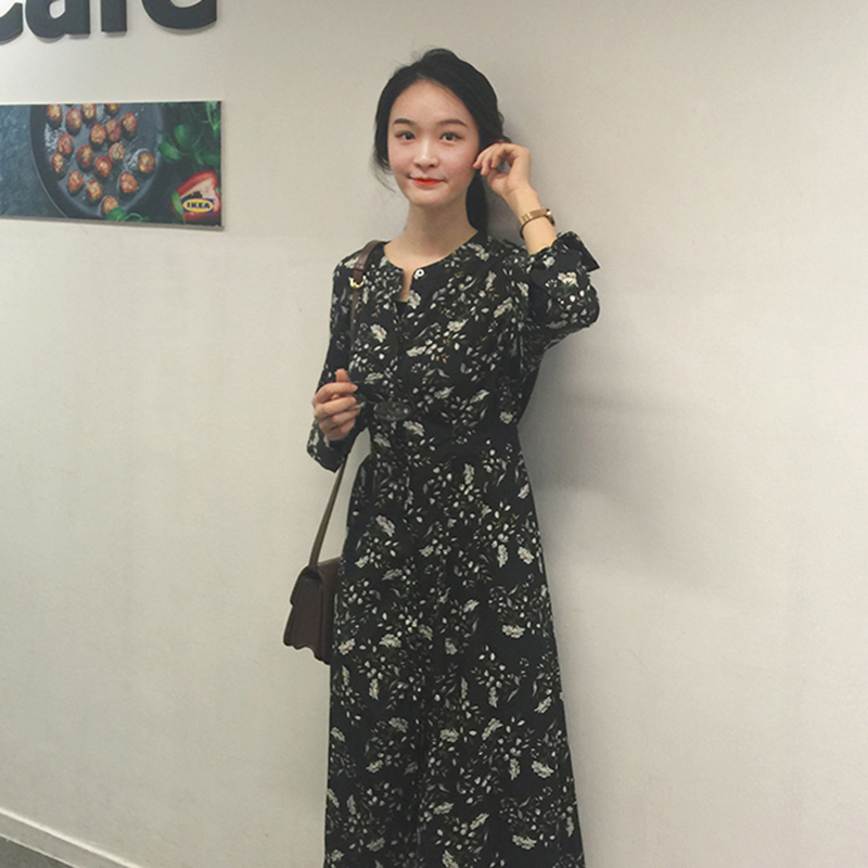 / 復古法式少女桔梗裙秋冬裝2018新款百搭寬松顯瘦開叉碎花連衣長裙
