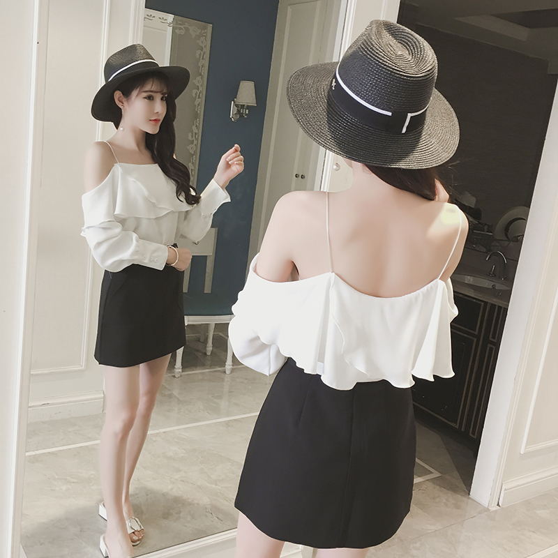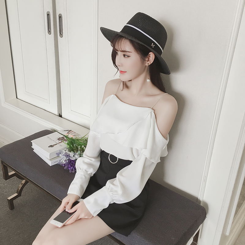 春夏新款女裝韓版一字領露肩荷葉邊吊帶雪紡衫女士燈籠袖露背上衣