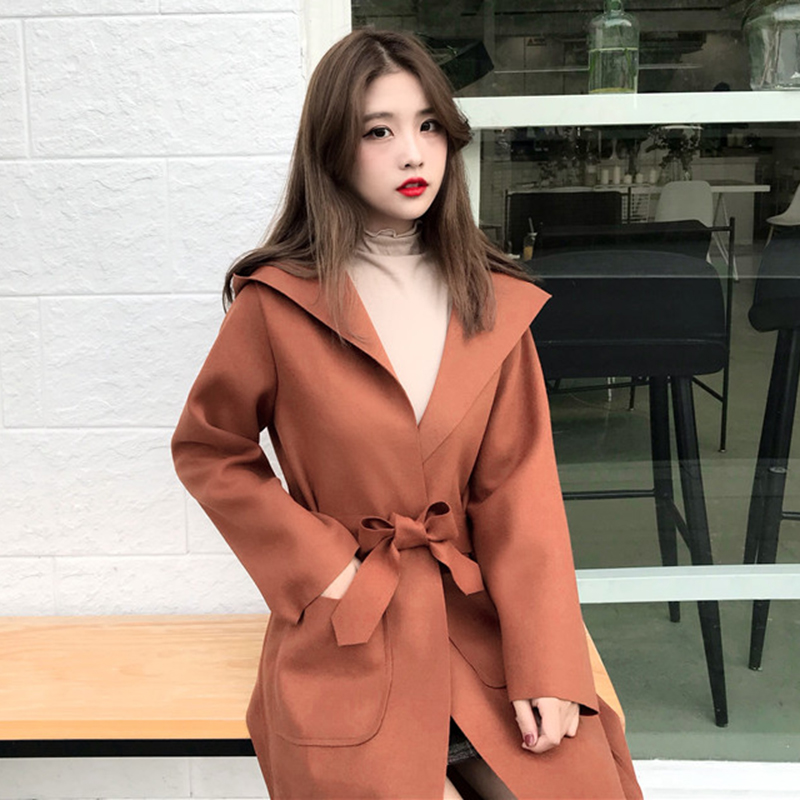 / 中長款流行呢子大衣女冬裝2018新款韓版寬松系帶收腰連帽毛呢外套