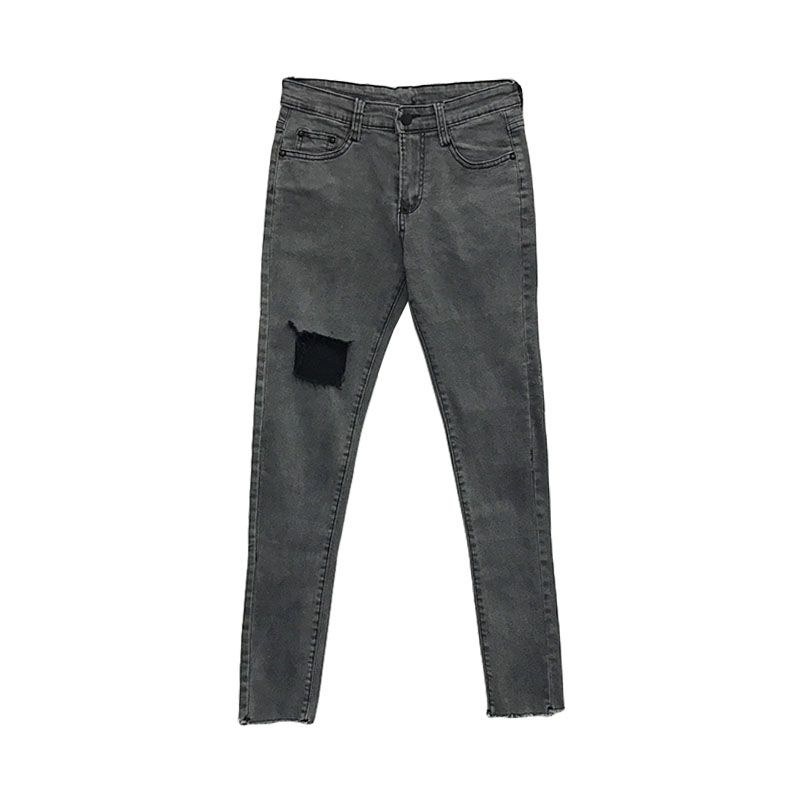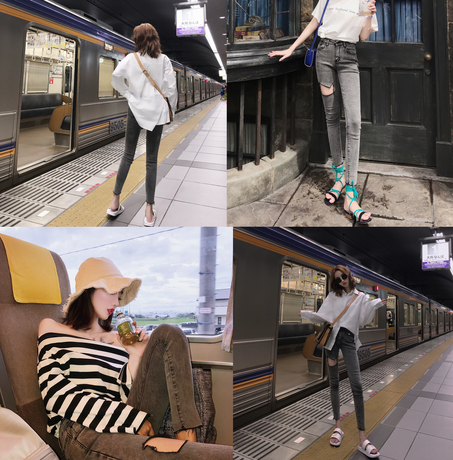 / 高腰黑煙灰色膝蓋割破洞毛邊小腳牛仔褲女秋2018新款顯瘦鉛筆褲潮