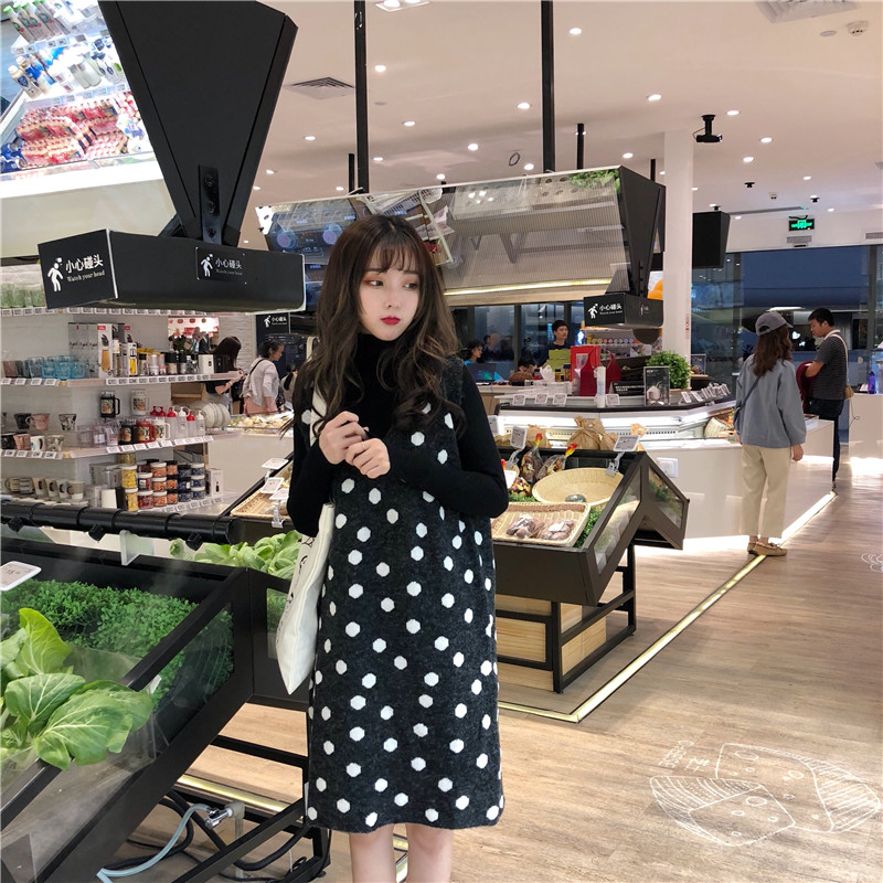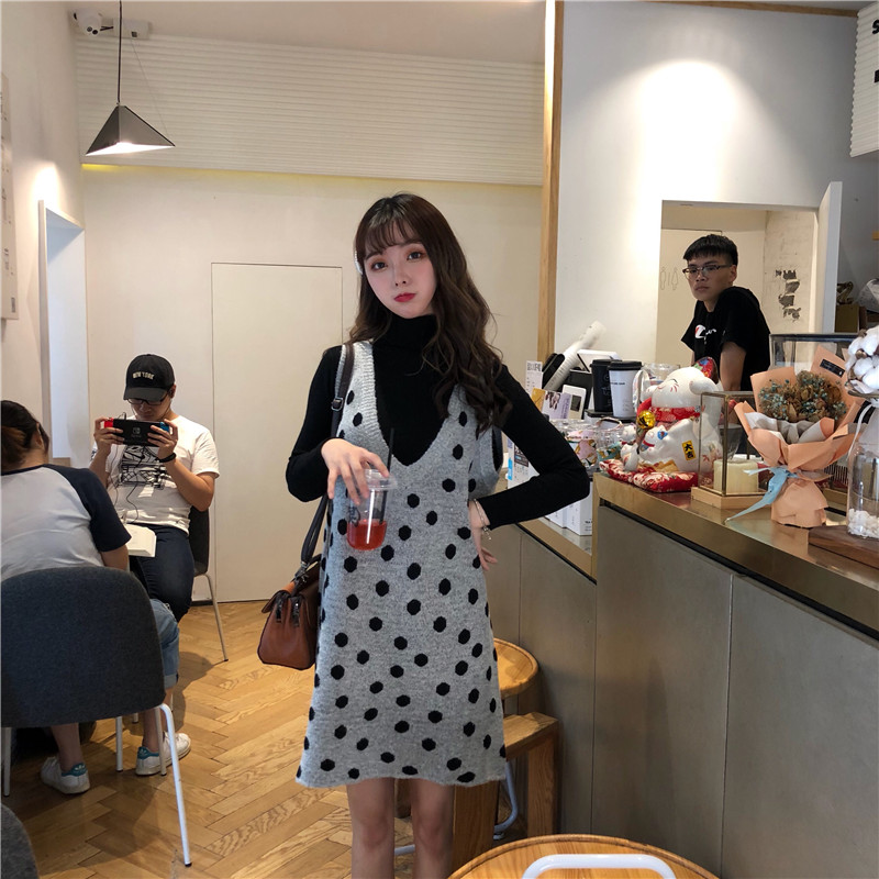 / 韓版時尚休閑套裝秋冬波點V領針織背心裙連衣裙+打底毛衣兩件套女