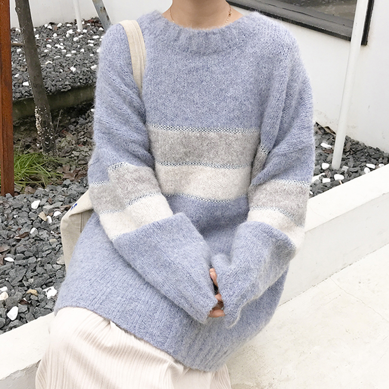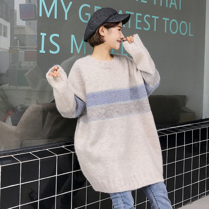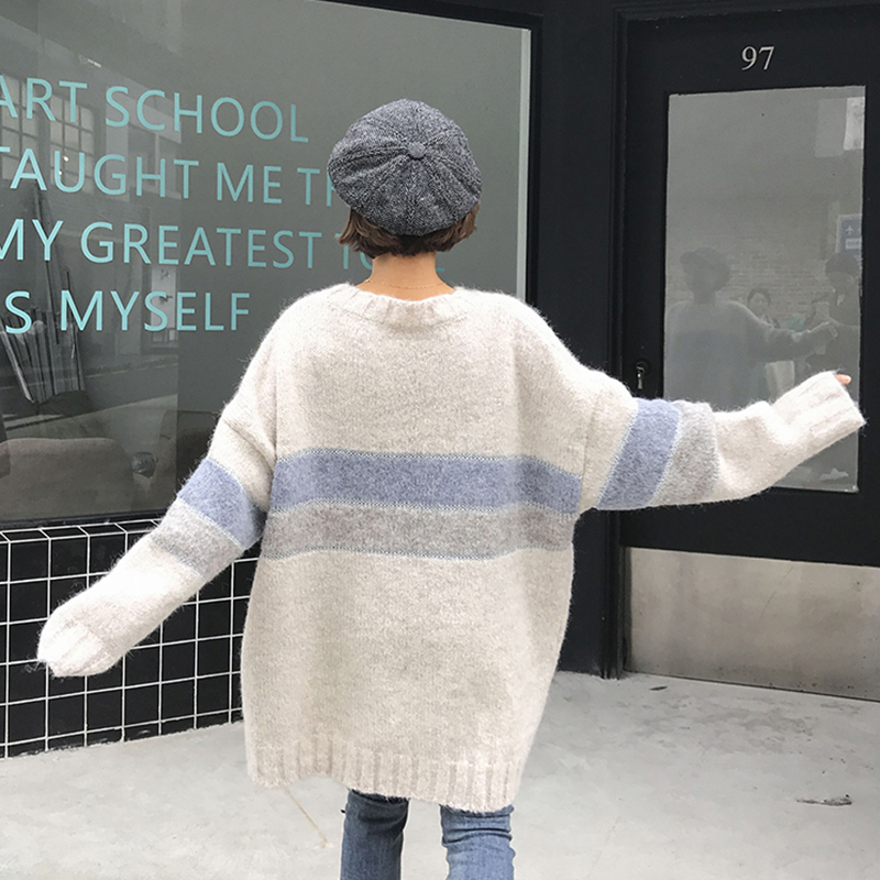 學院風中長款條紋毛衣外套女冬裝2018新款韓版百搭寬松長袖針織衫