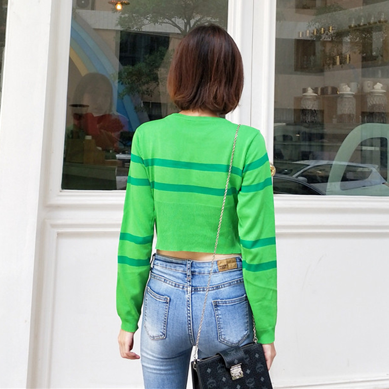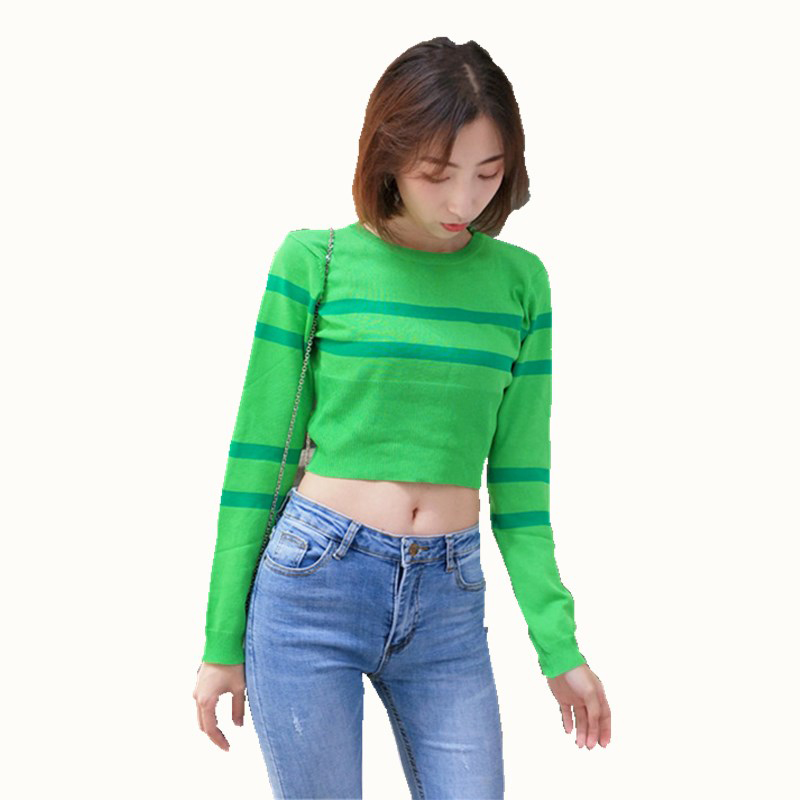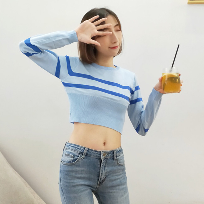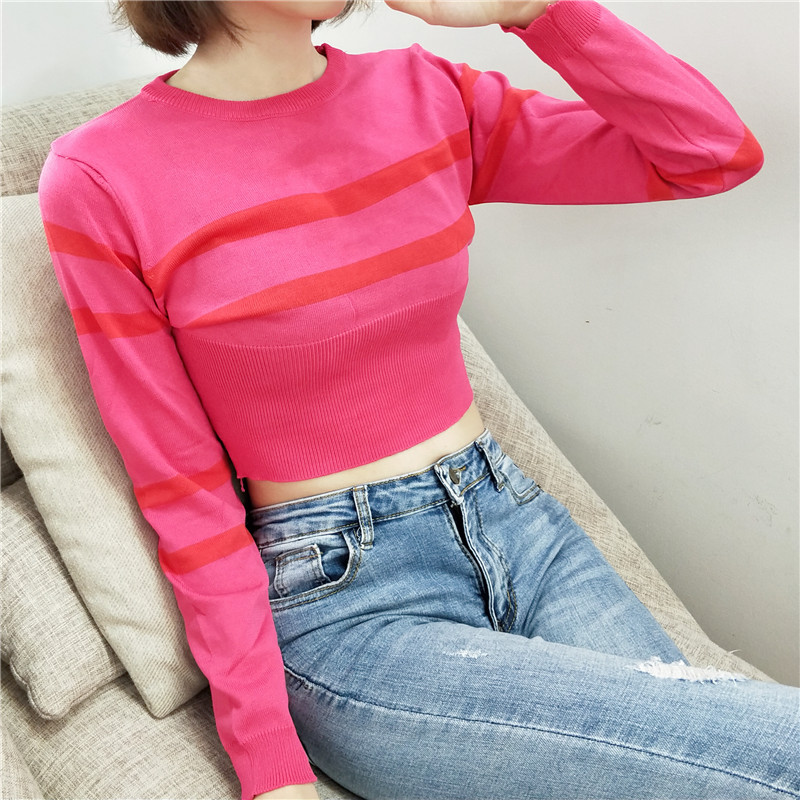 / 韓版修身顯瘦撞色條紋打底針織衫女秋裝新款學生短款露臍長袖上衣