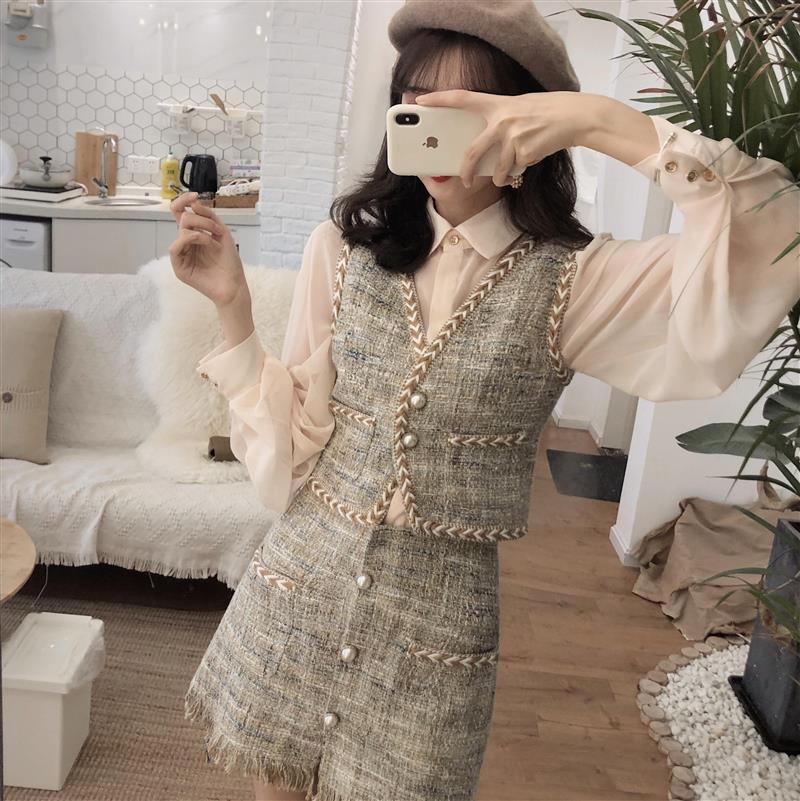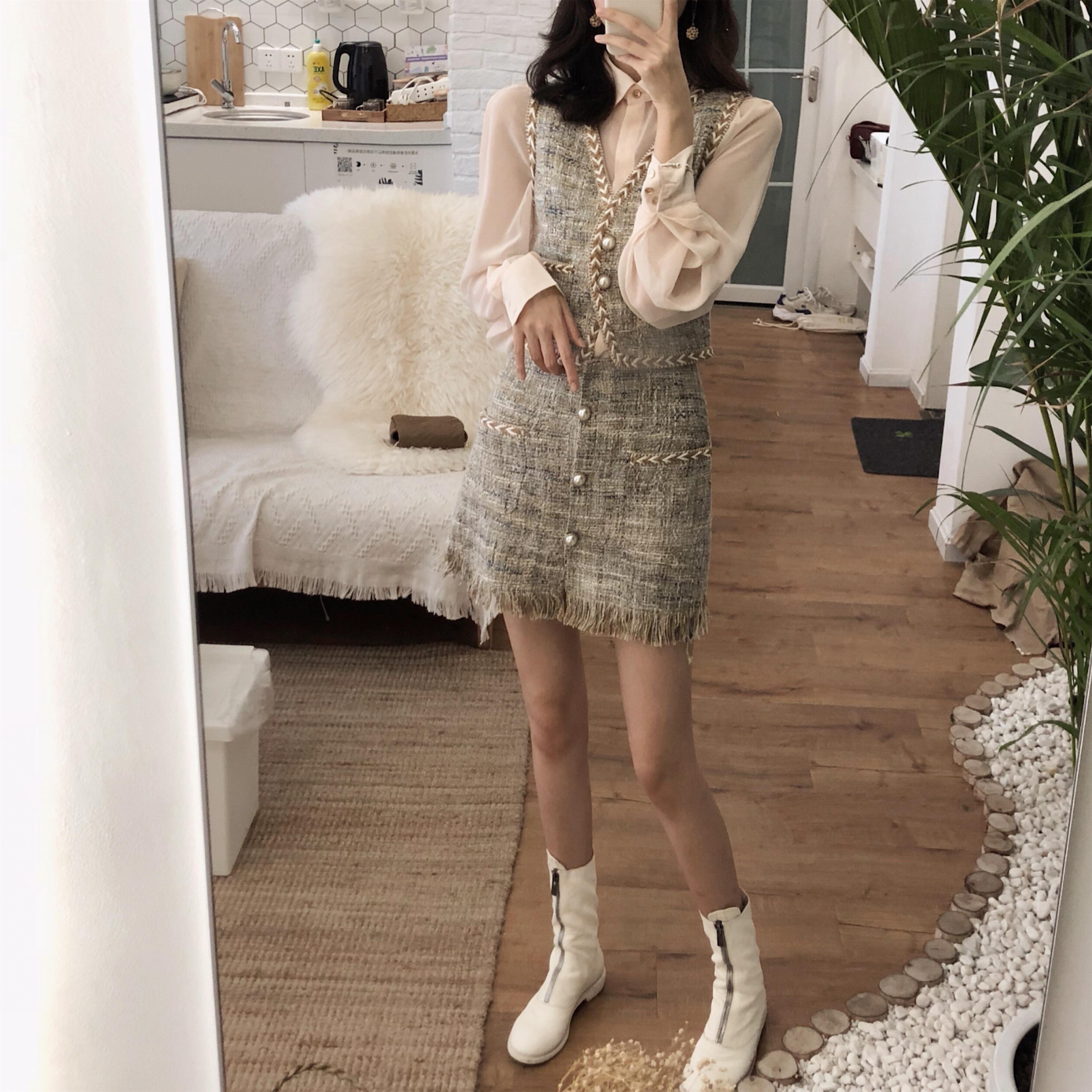 上衣是V領馬甲,2顆米色圓扣非常別致,