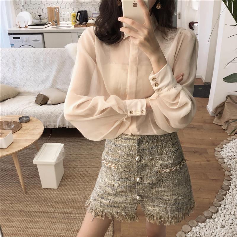 下身高腰短裙,下面3顆米色圓扣有內襯