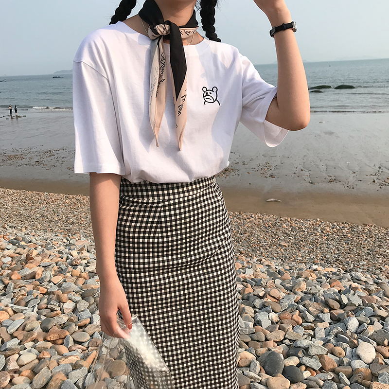 夏季新款女裝刺繡寬松顯瘦純色學生百搭圓領短袖t恤打底衫上衣女