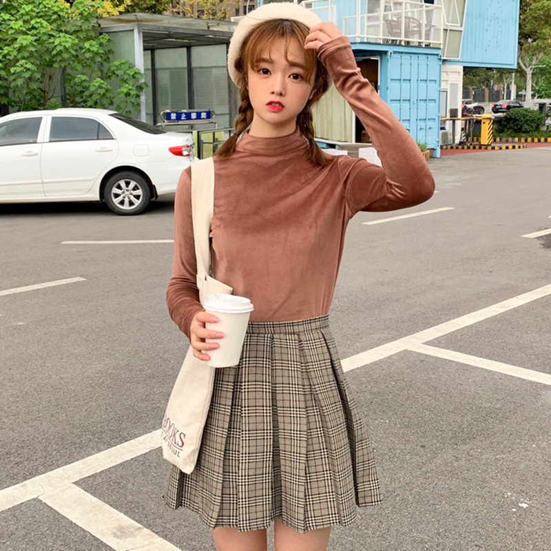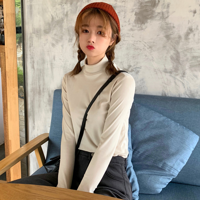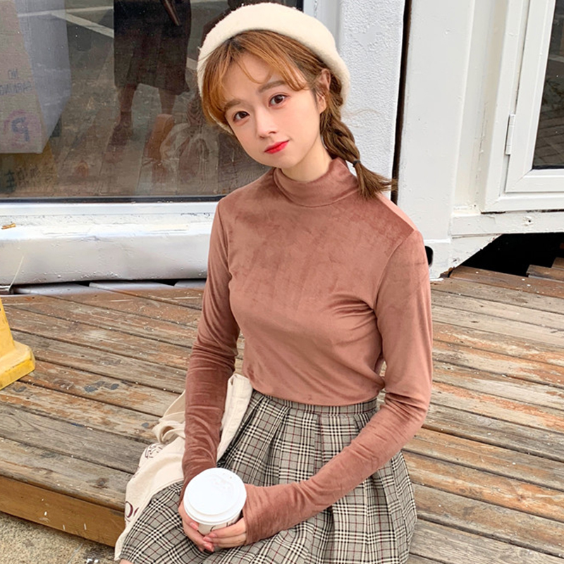 / 半高領修身顯瘦打底衫女秋冬裝新款絲絨保暖長袖上衣學生純色T恤