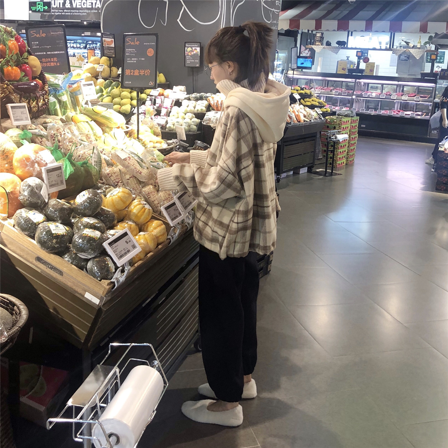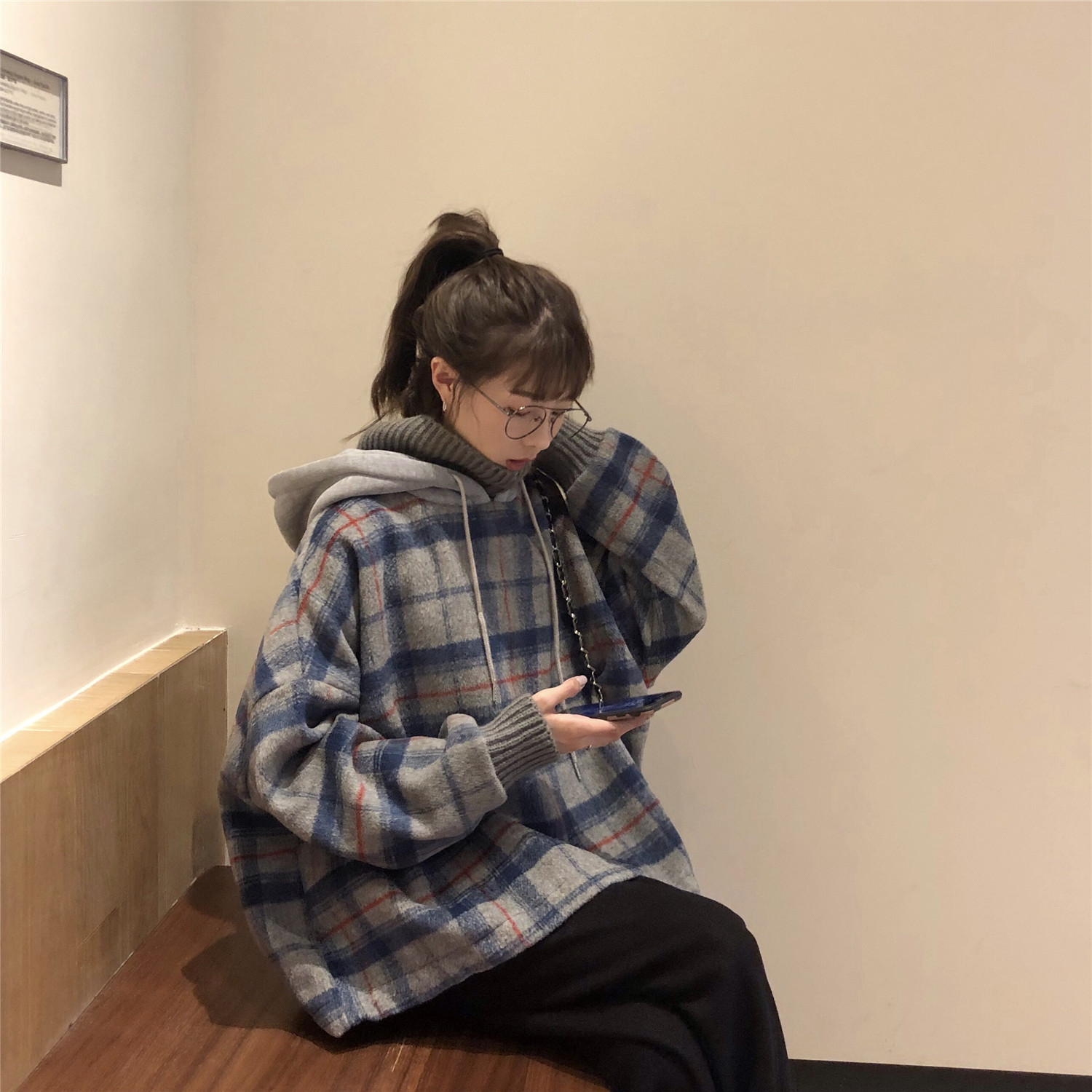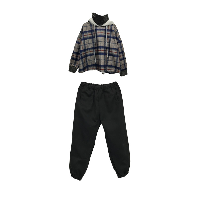 / 韓版拼接格子高領加絨加厚寬松衛衣女外套+呢子寬松蘿卜褲兩件套