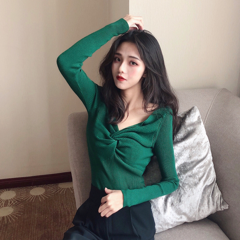 初秋溫柔風毛衣女長袖紐結針織衫韓版港味交叉純色打底衫修身毛衣