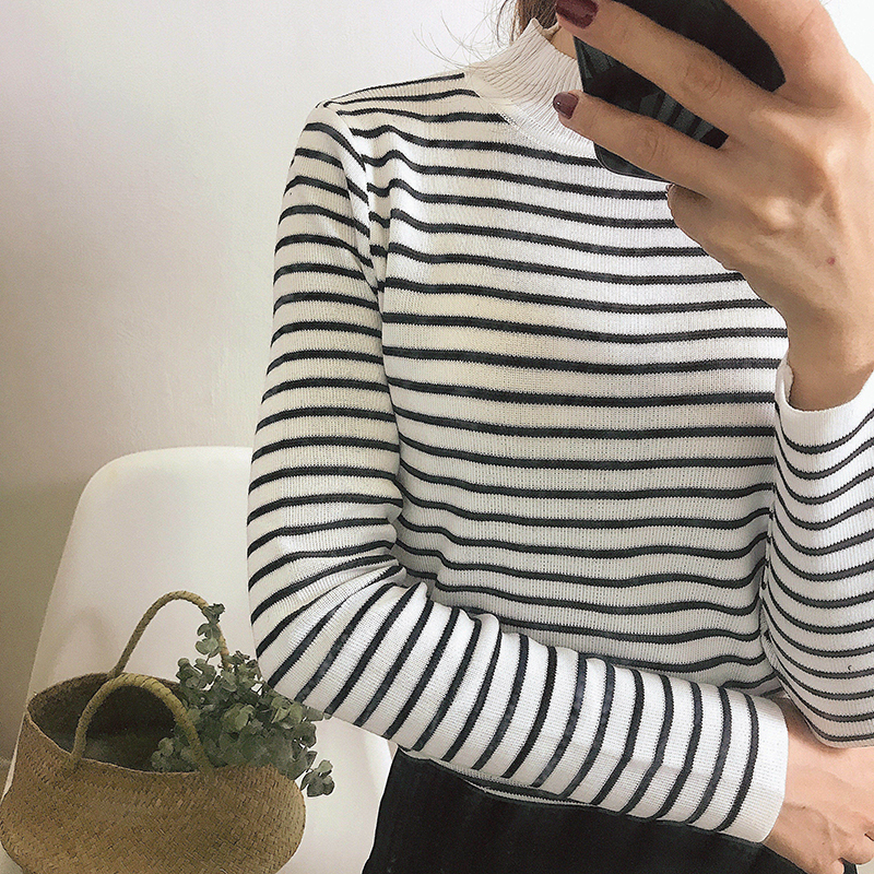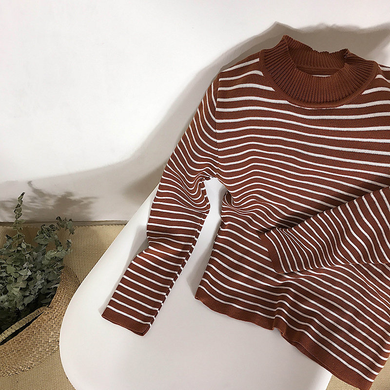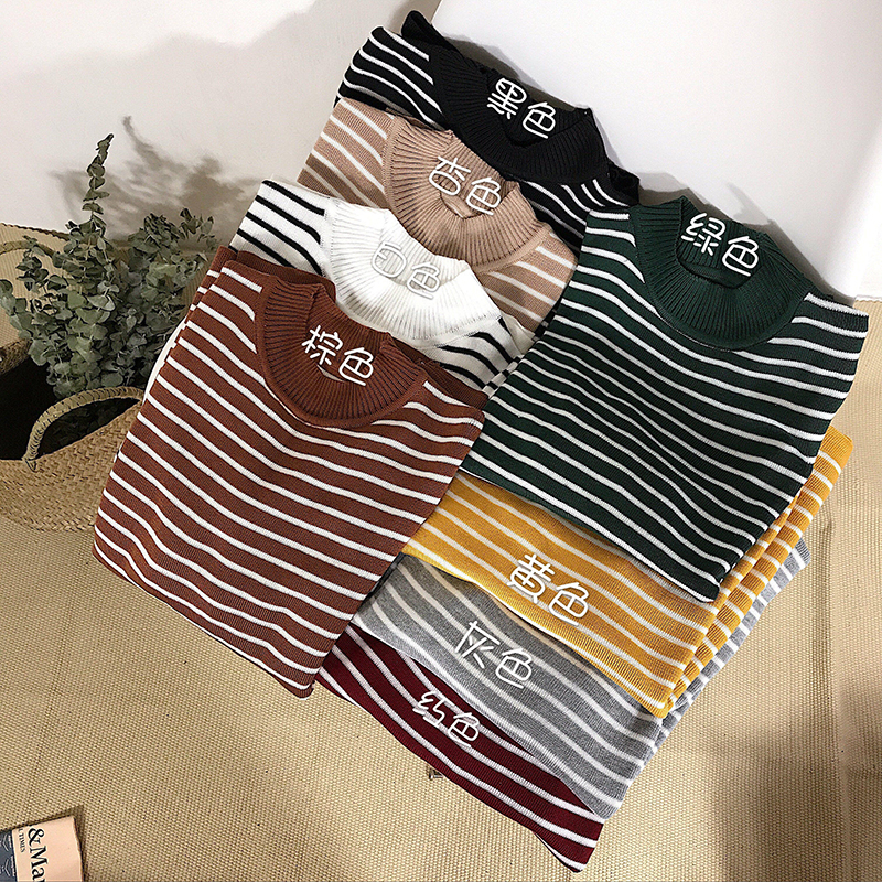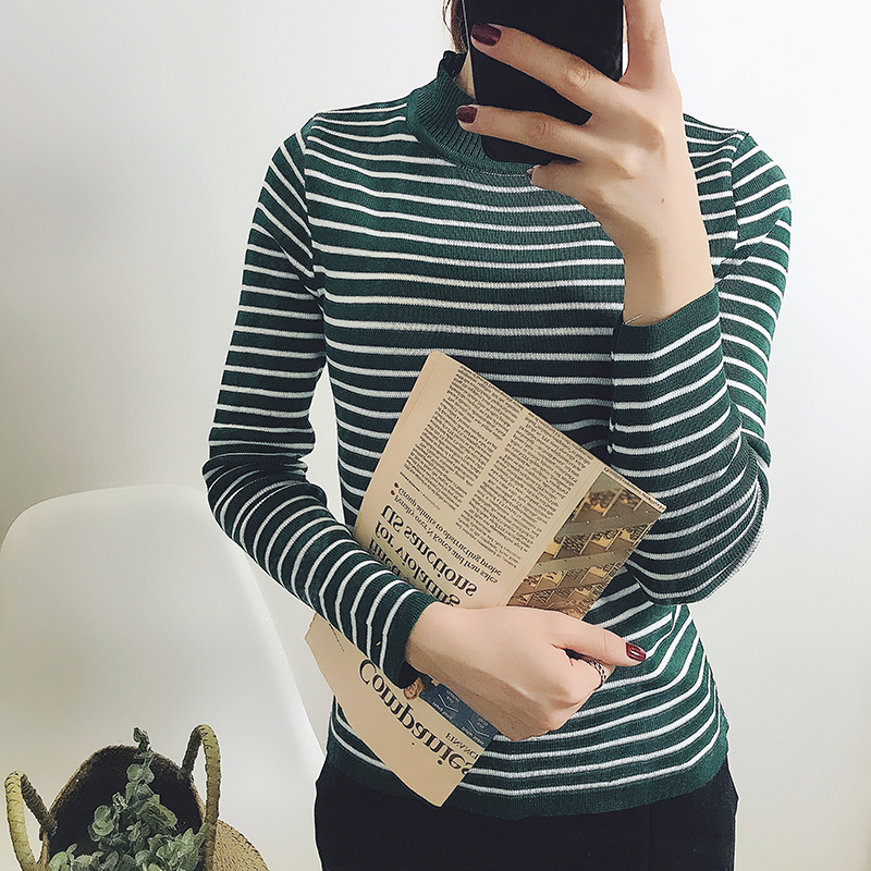氣質chic條紋圓領針織衫女秋冬裝2018新款韓版修身顯瘦長袖打底衫