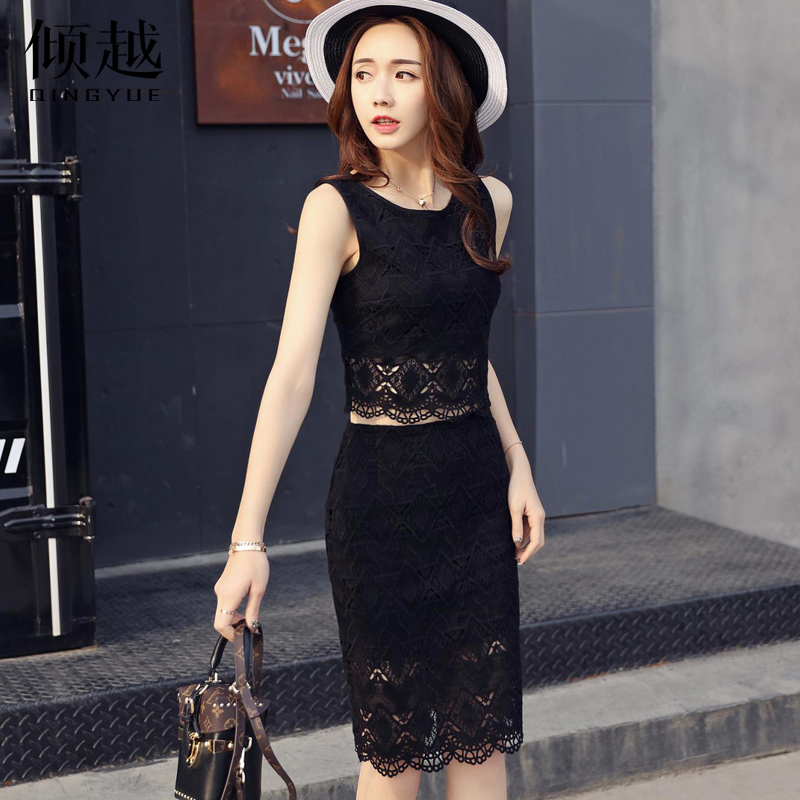 蕾絲連衣裙潮2017夏季新款韓版女裝無袖包臀時尚套裝裙休閑兩件套