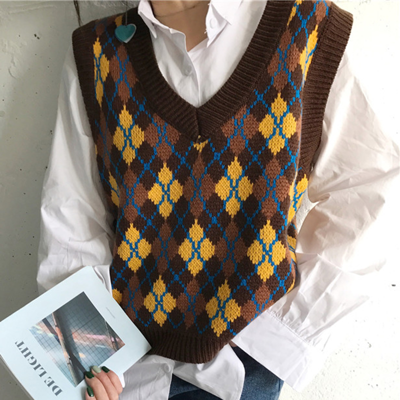 學生拼色提花針織背心馬甲秋裝女2018新款復古風短款V領毛衣上衣