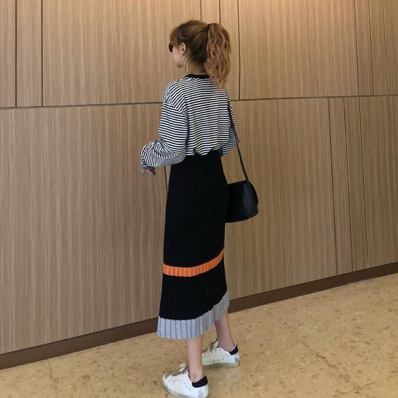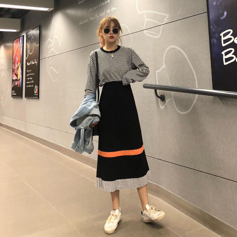 / 高腰顯瘦拼色A字裙女秋裝新款學生針織半身裙子復古風中長百褶裙