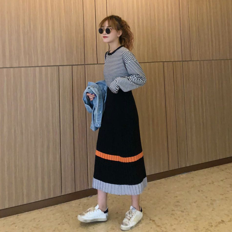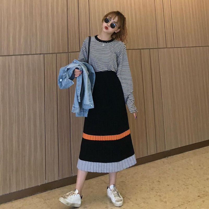 高腰顯瘦拼色A字裙女秋裝新款學生針織半身裙子復古風中長百褶裙