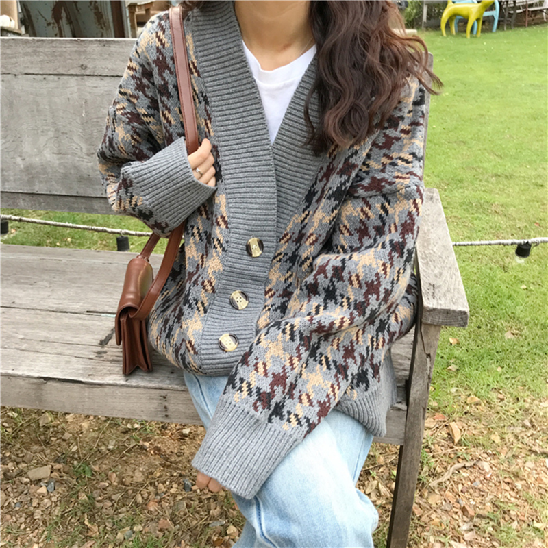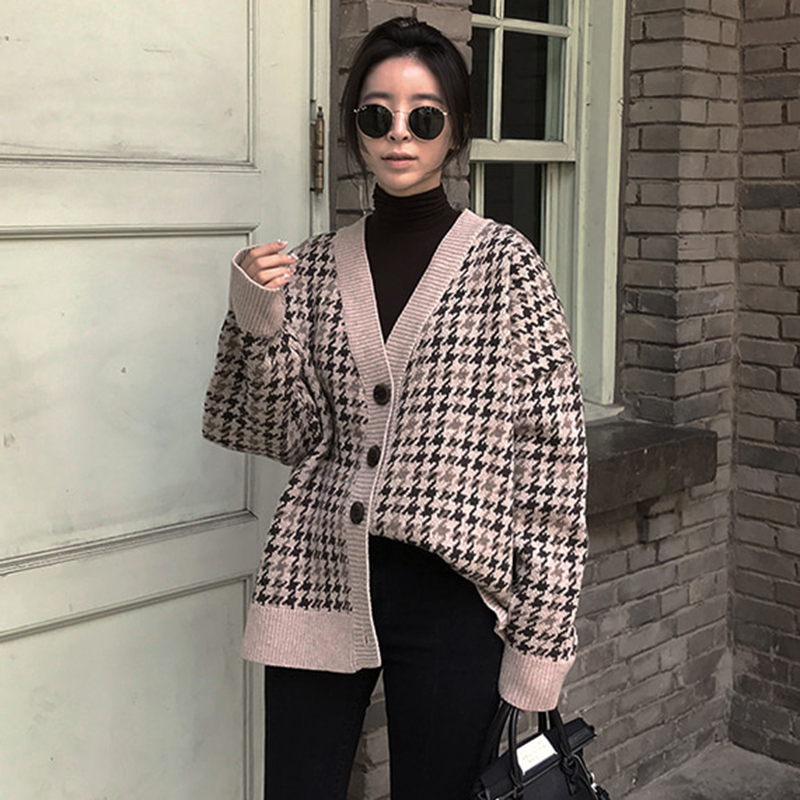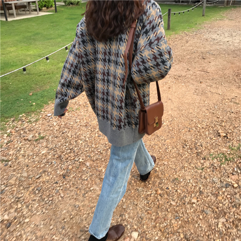 / 復古千鳥格開衫毛衣秋冬裝女2018新款學生寬松V領慵懶風休閑外套