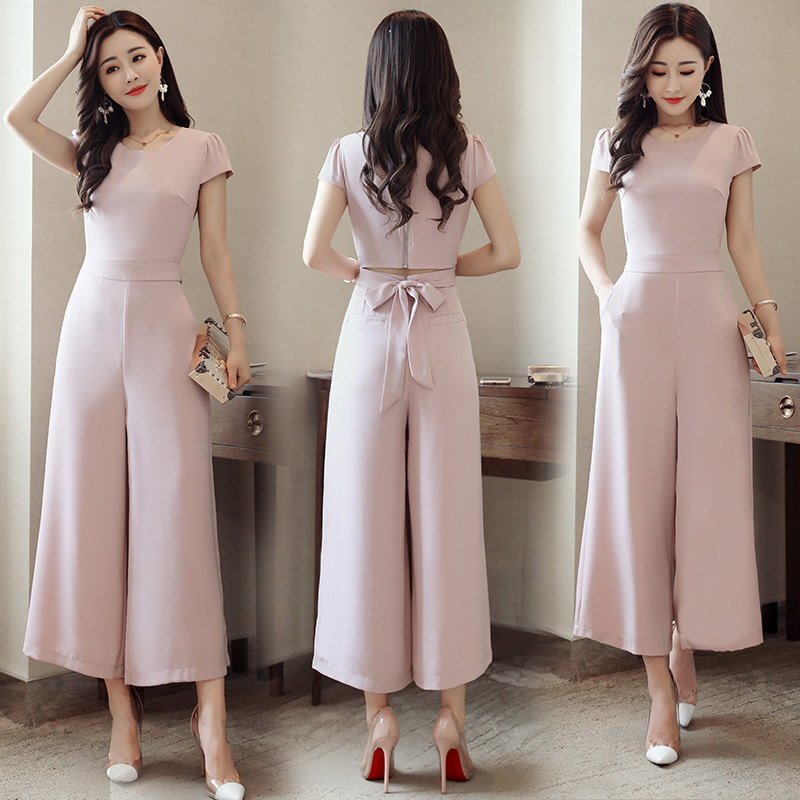 / 連體褲女夏韓版氣質修身顯瘦闊腿褲圓領短袖純色連衣褲2017新款潮