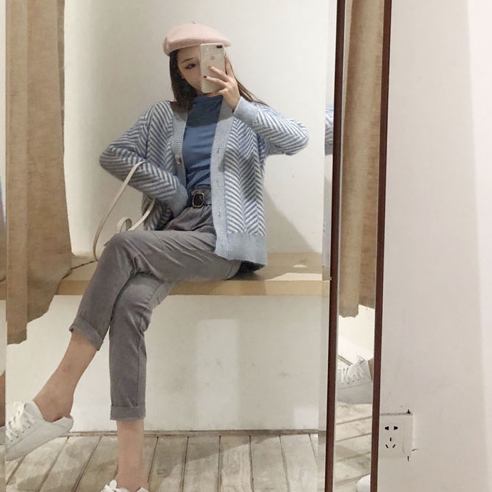 藍色打底T恤|灰色休閑褲送腰帶|藍色毛衣開衫