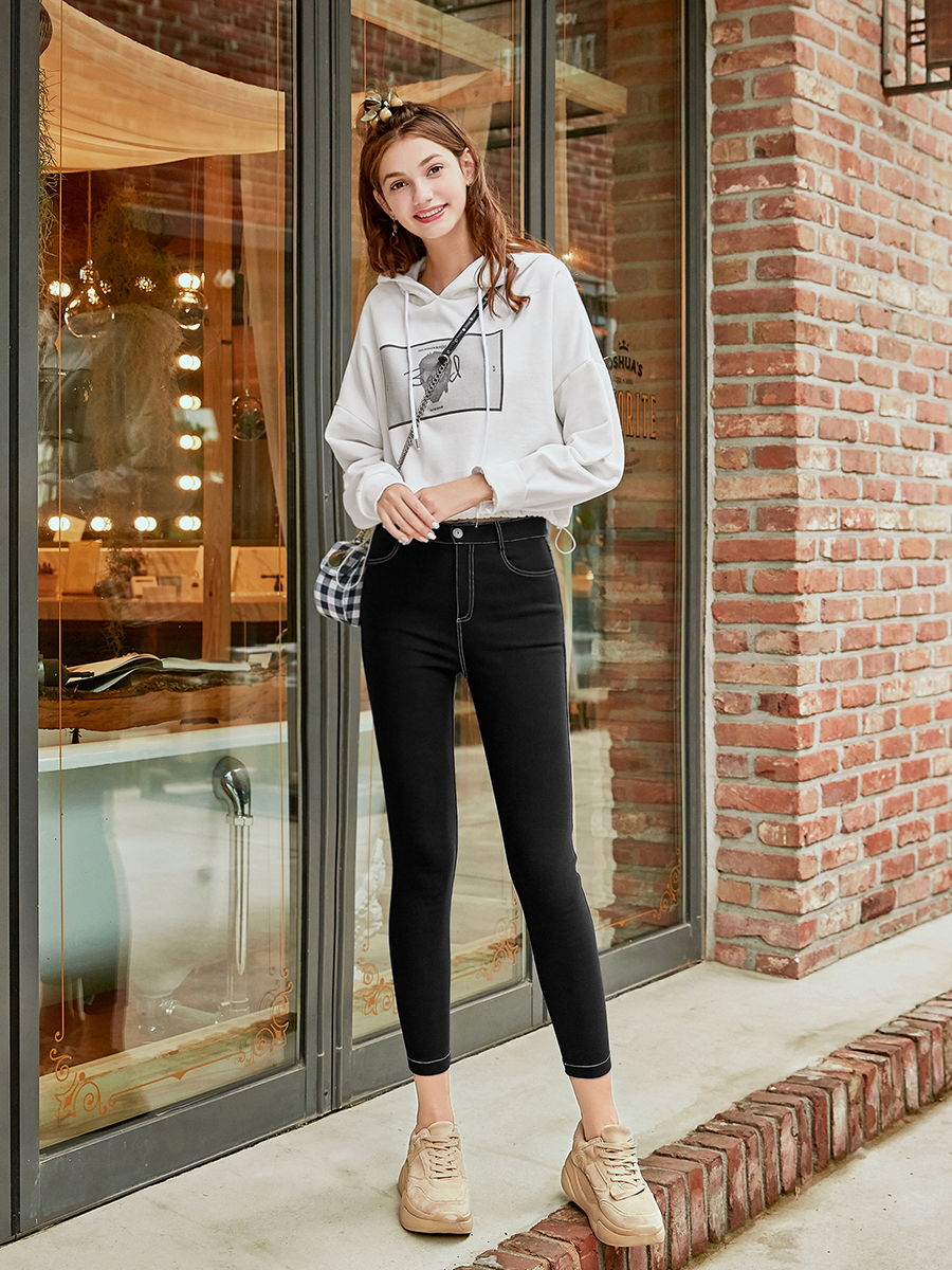 / MG小象黑色緊身小腳褲女秋冬時尚高腰休閑鉛筆褲外穿打底九分褲子