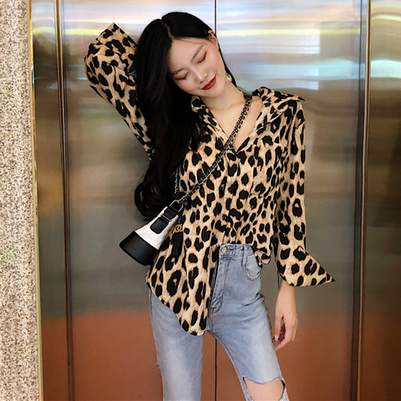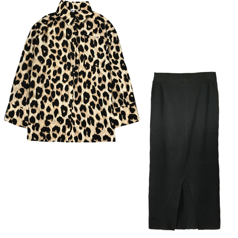 港風寬松長袖時尚豹紋襯衫女裝韓版高腰針織開叉半身裙氣質套裝秋
