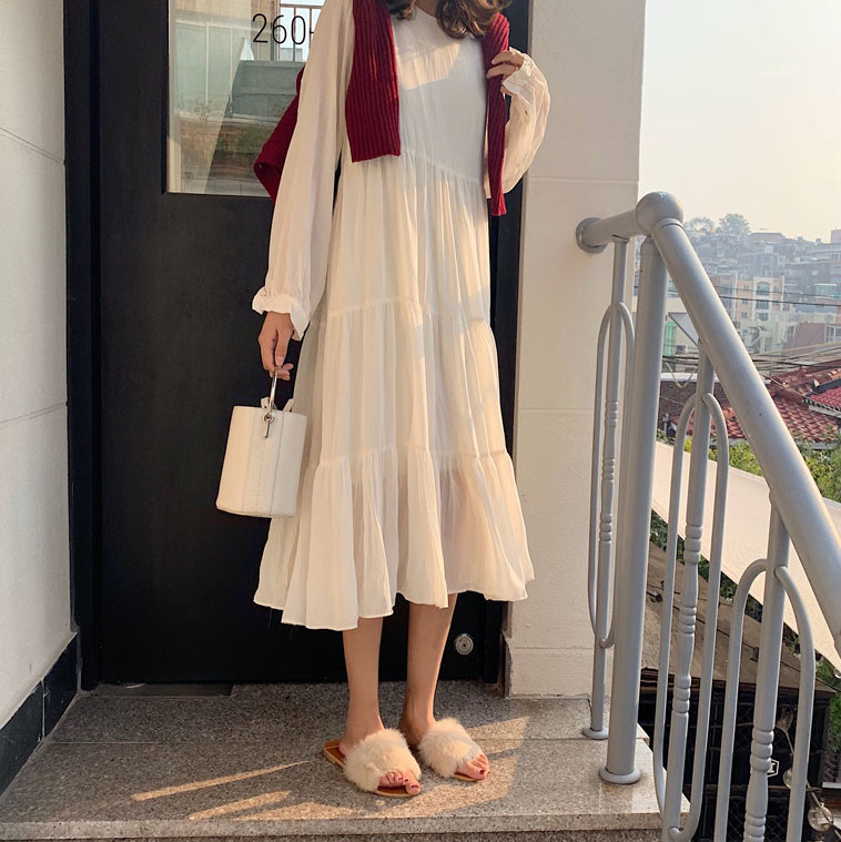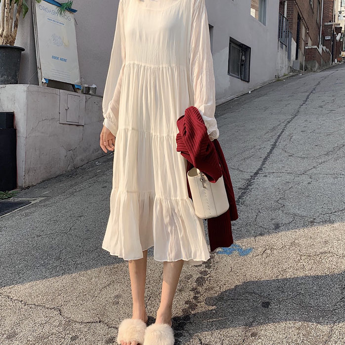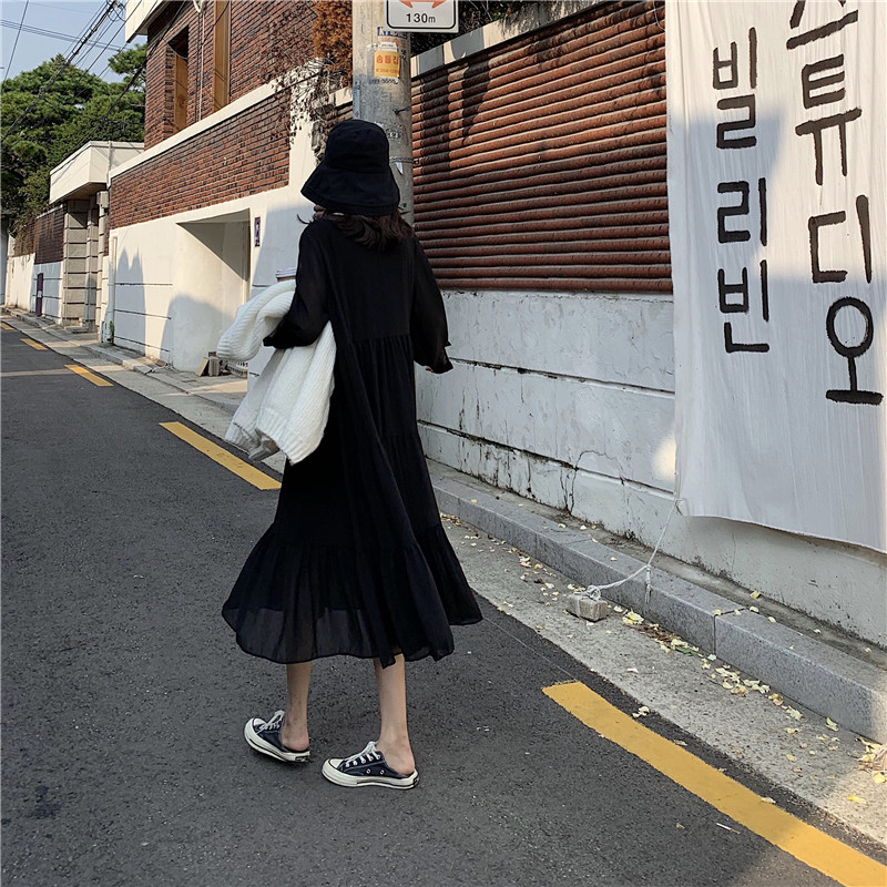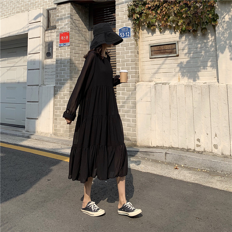 chic秋冬裙子長裙女慵懶風時尚韓系寬松百搭雪紡純色打底連衣裙女