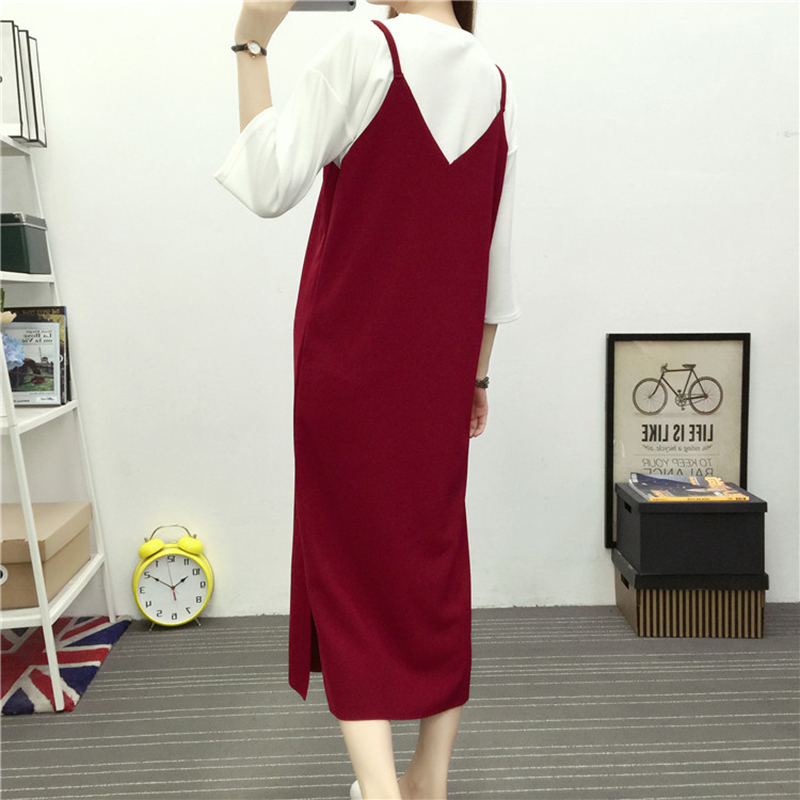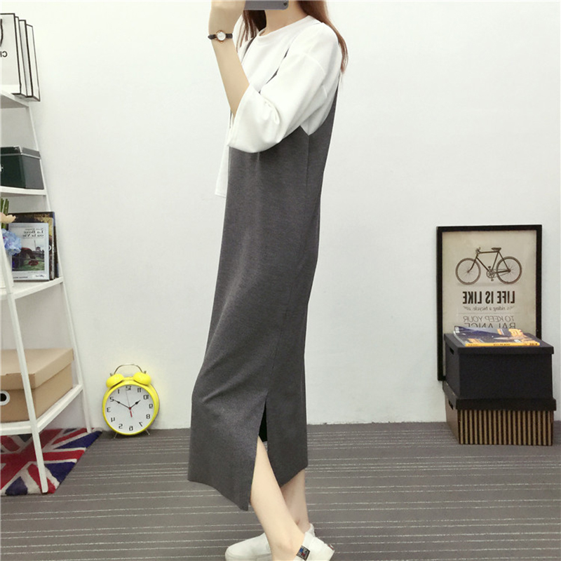 時尚兩件套秋裝女2018新款開叉吊帶打底連衣裙子寬松圓領上衣T恤