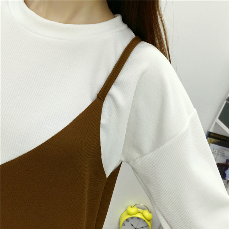 / 時尚兩件套秋裝女2018新款開叉吊帶打底連衣裙子寬松圓領上衣T恤