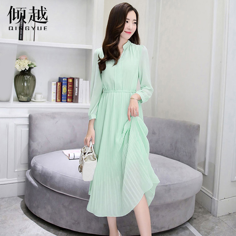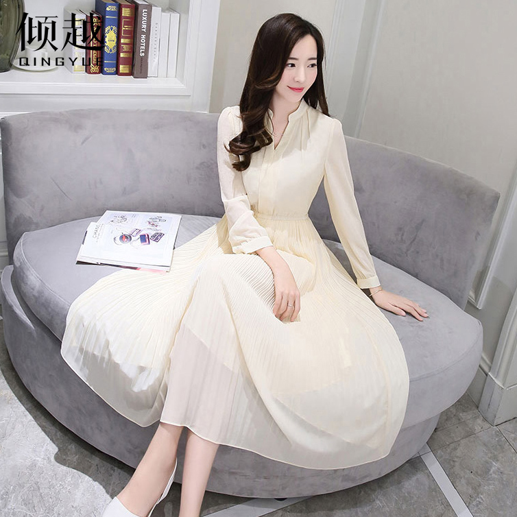 傾越雪紡連衣裙女中長款2017新款春夏百搭v領氣質長袖修身百褶裙