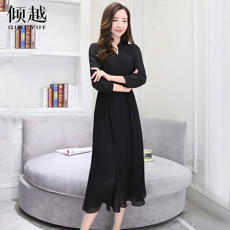 / 傾越雪紡連衣裙女中長款2017新款春夏百搭v領氣質長袖修身百褶裙