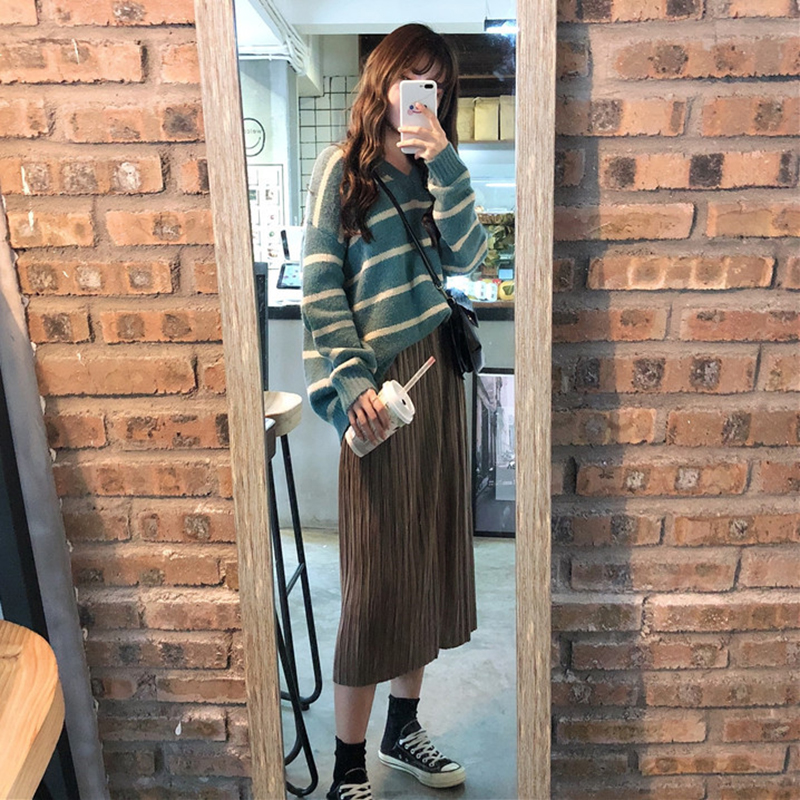 毛衣配裙子兩件套女秋冬新款寬松V領條紋毛衣高腰百褶A字半身裙子