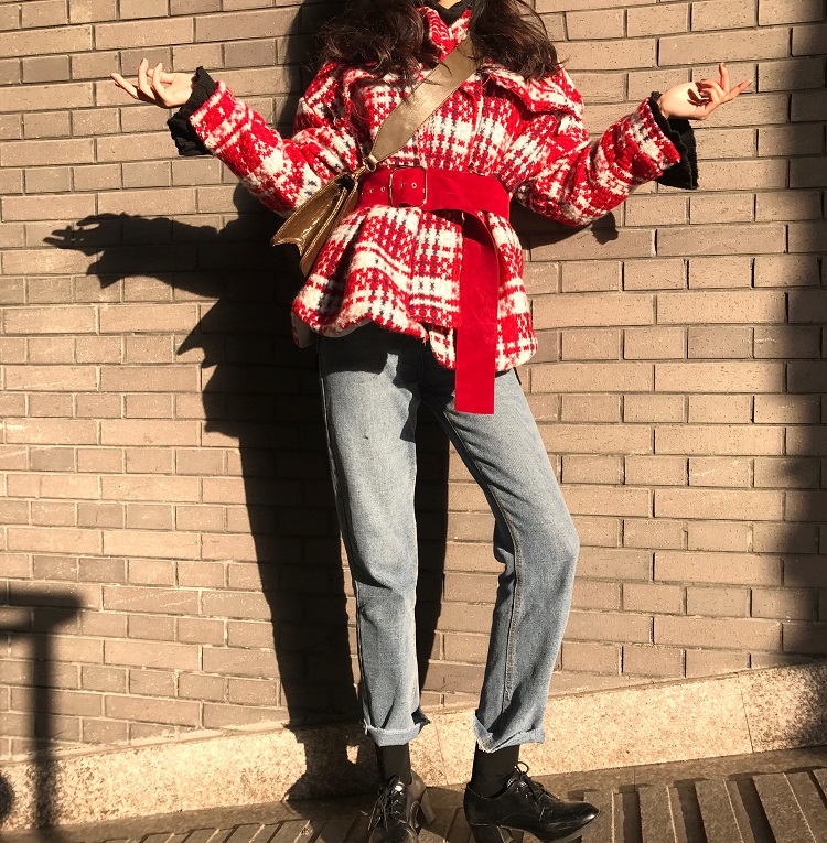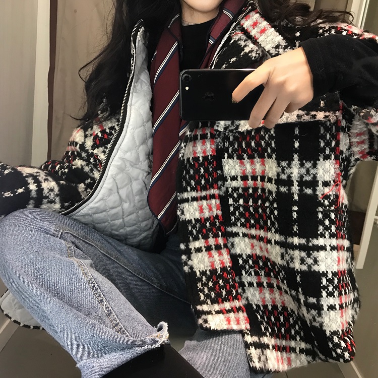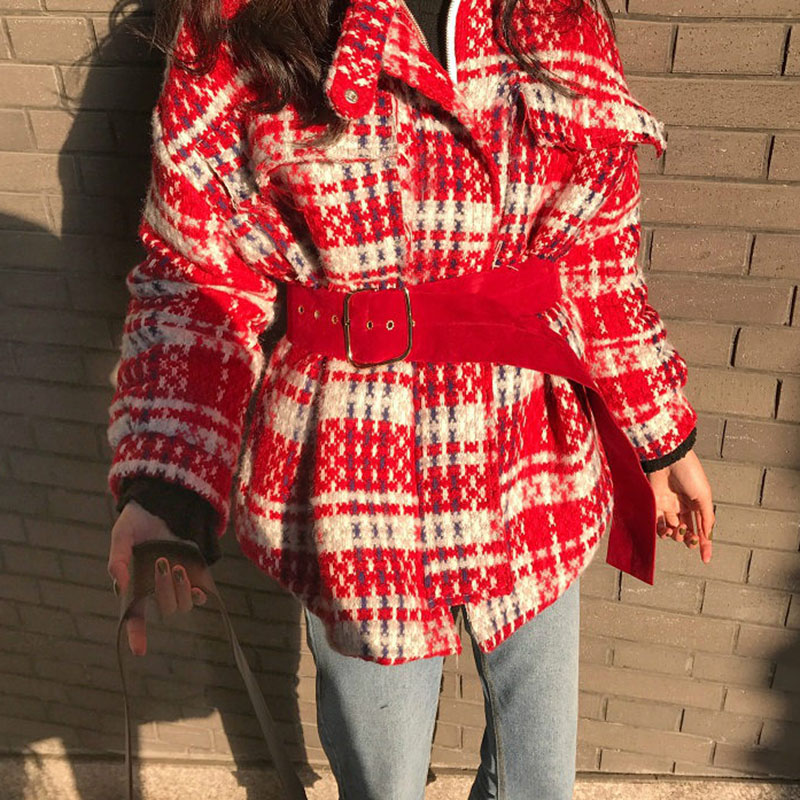 / 冬裝新款chic風復古韓版慵懶寬松加厚千鳥格毛呢外套女上衣配腰帶