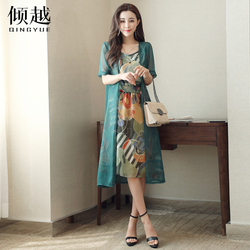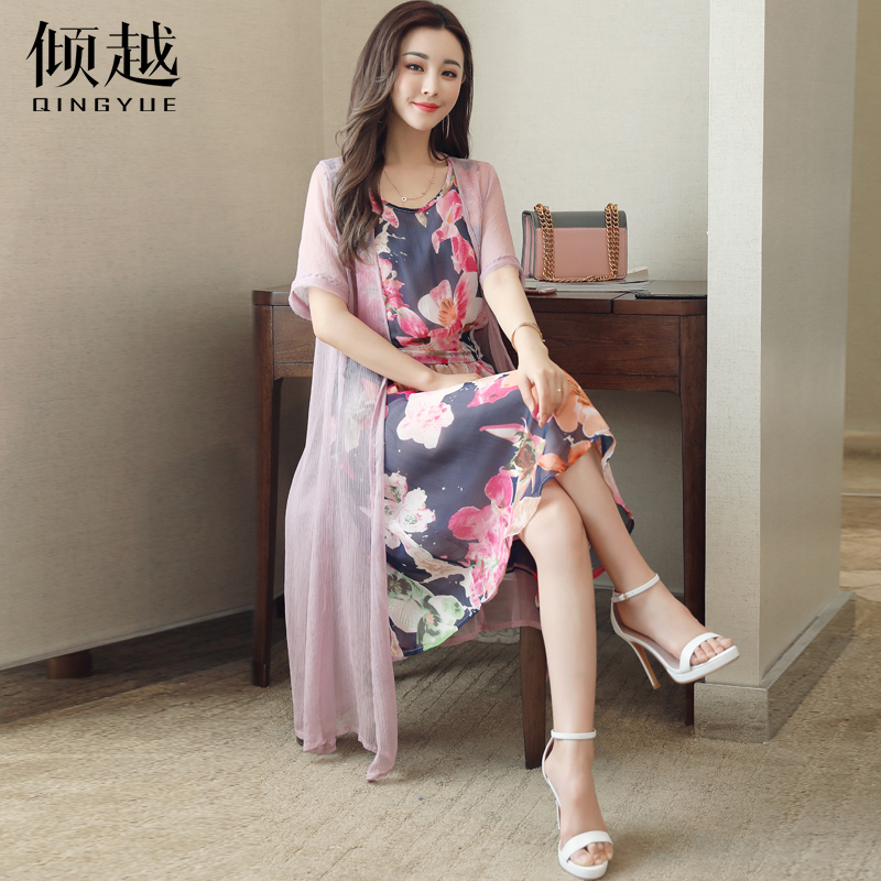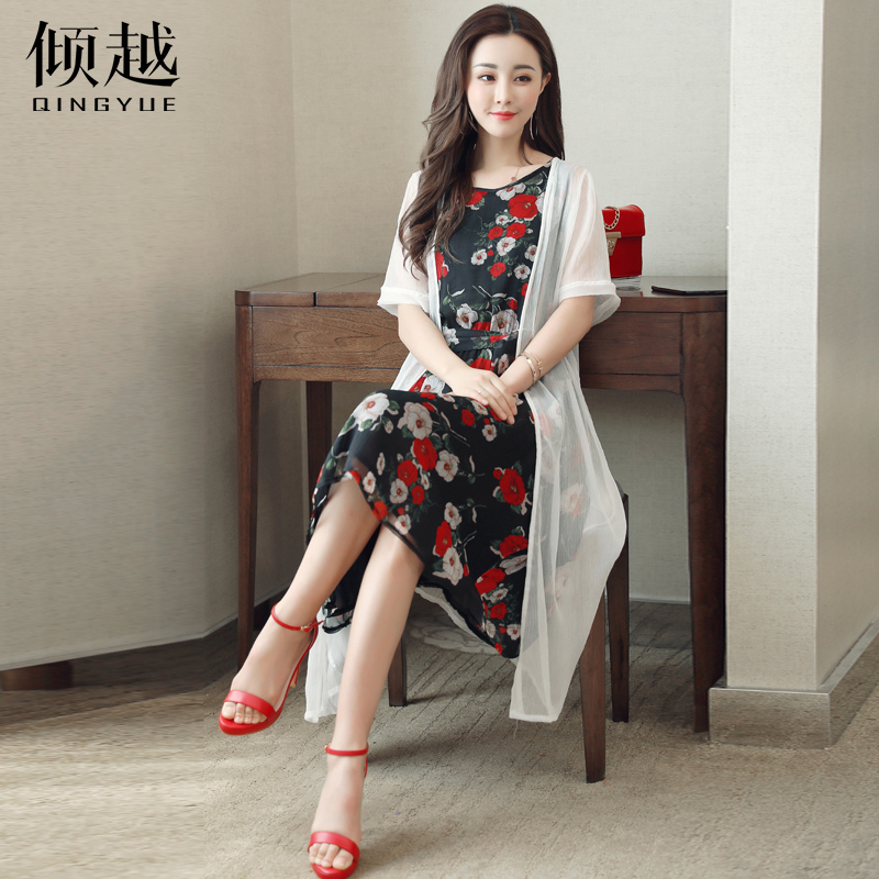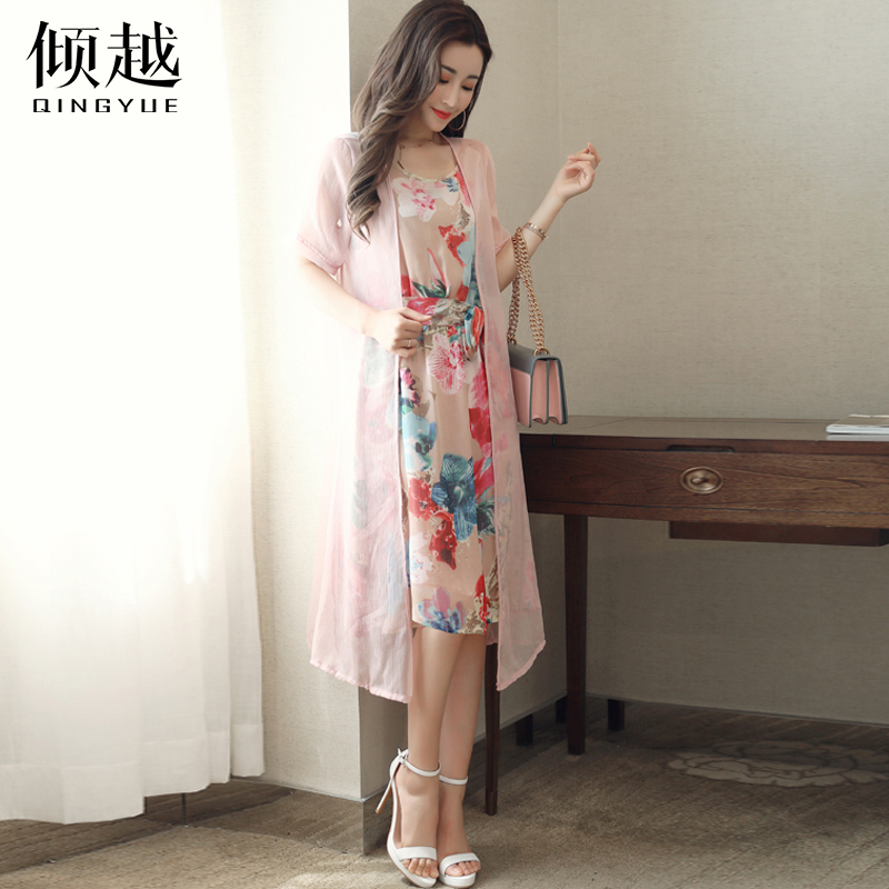 2017夏季印花披肩開衫兩件套雪紡連衣裙女新款中長款時尚套裝裙子