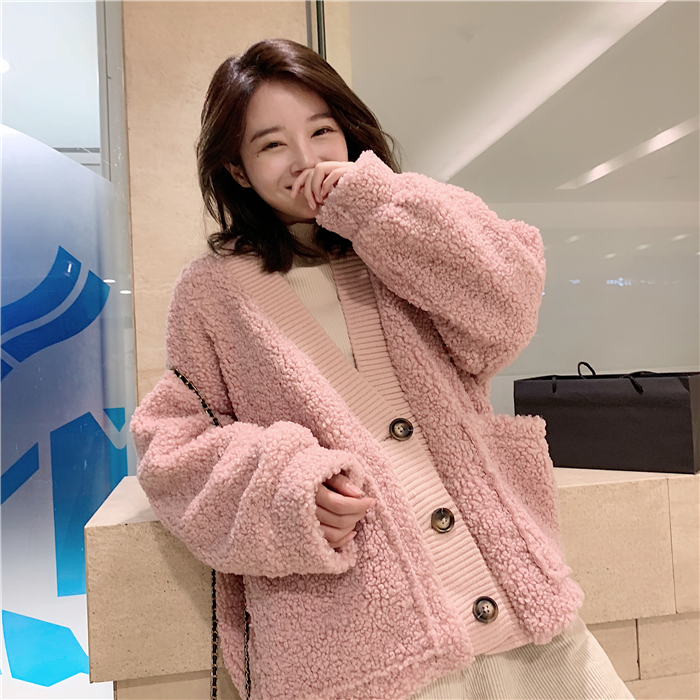 外套秋女2018新款加厚保暖V領單排扣口袋長袖寬松百搭羊羔毛大衣