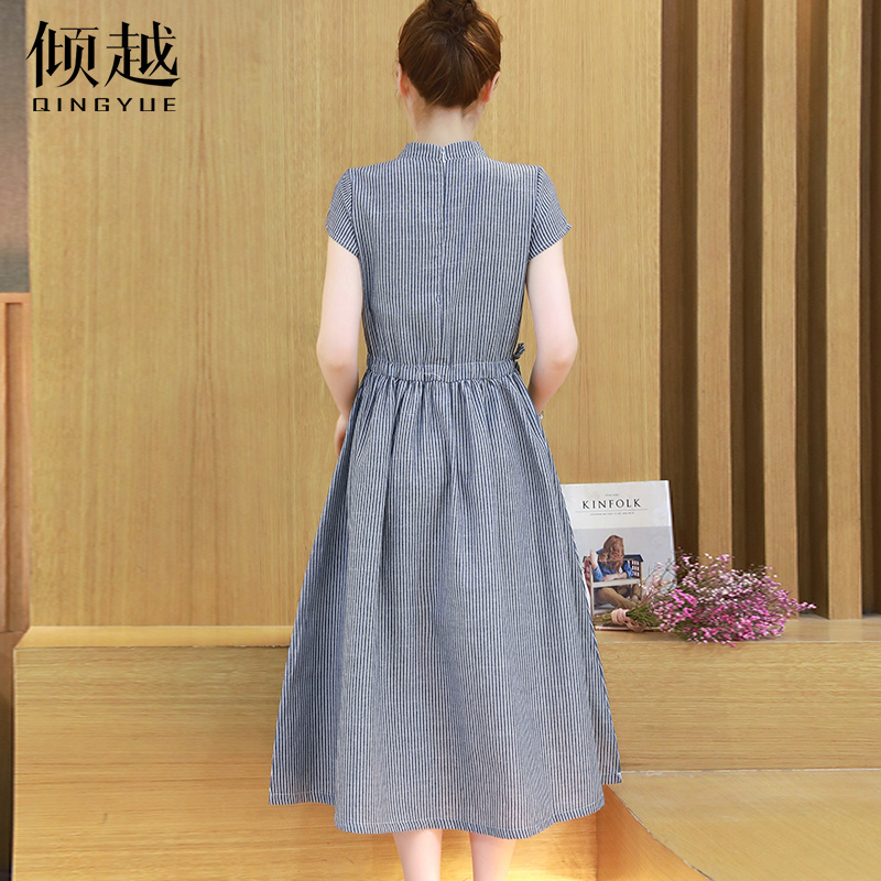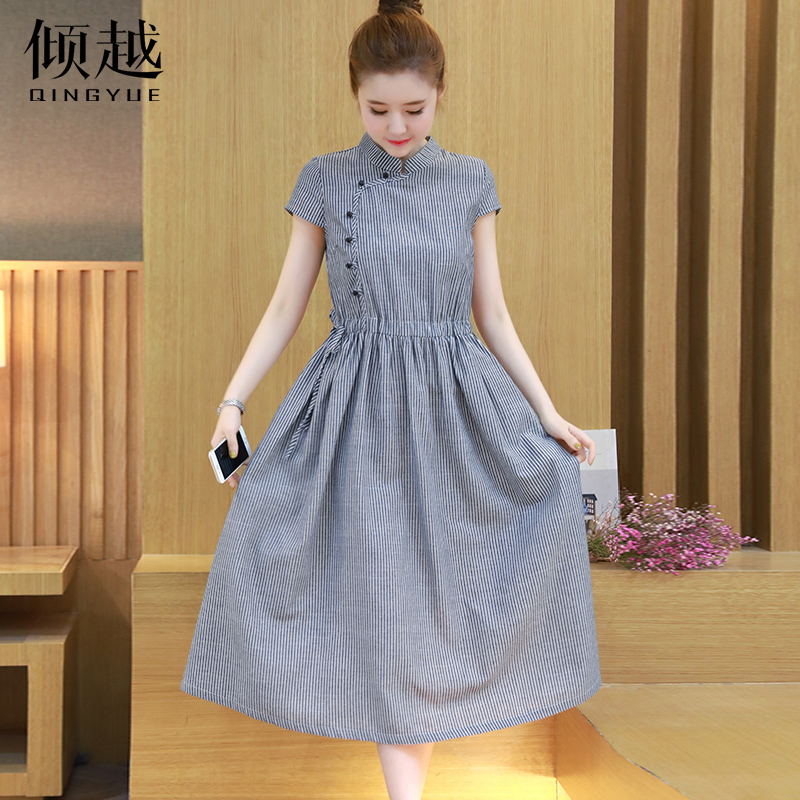 / 2017夏季新款大碼女裝條紋百搭連衣裙修身氣質中長款旗袍長裙子潮