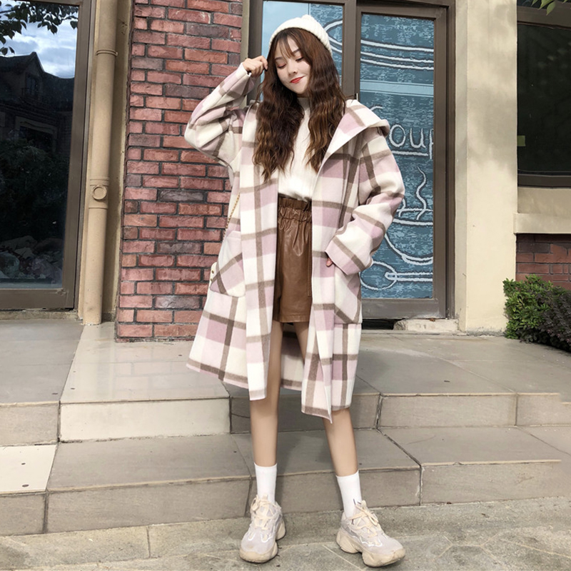 / 連帽大衣秋冬女裝2018流行新款學生寬松中長款雙口袋格子毛呢外套