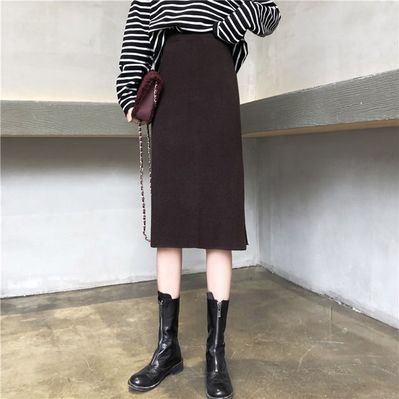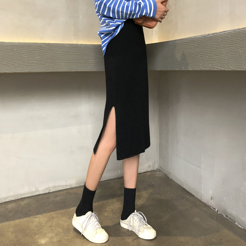 / 高腰顯瘦開叉針織半身裙子女秋冬裝新款學生復古風黑色包臀中長裙