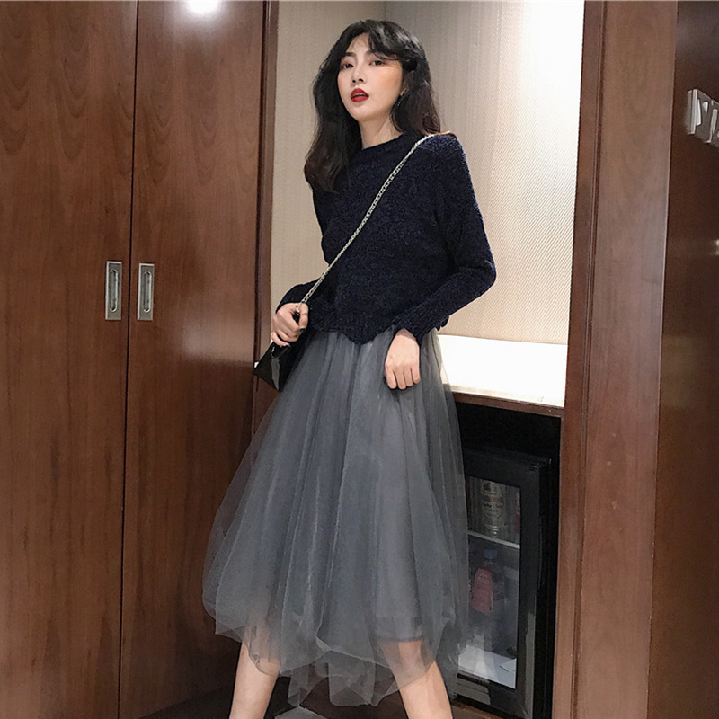 毛衣配裙子兩件套女秋裝新款不規則慵懶針織衫高腰顯瘦網紗半身裙