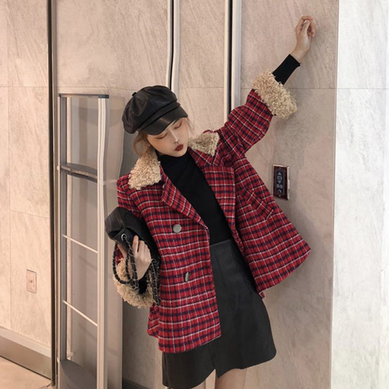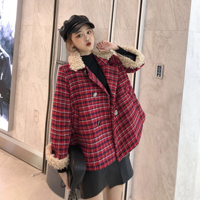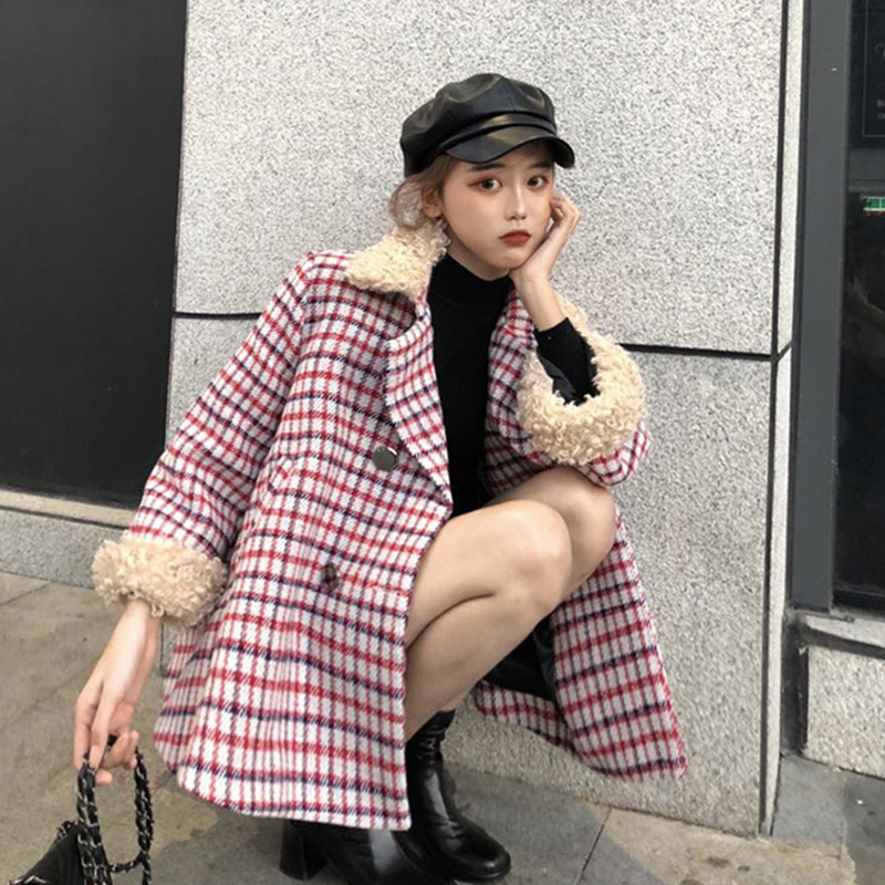 / 韓版洋氣領口袖口羊卷毛雙排扣翻領格子大衣毛呢+打底衫兩件套潮