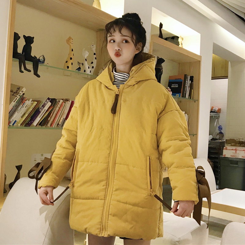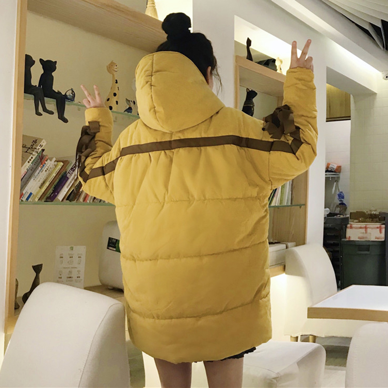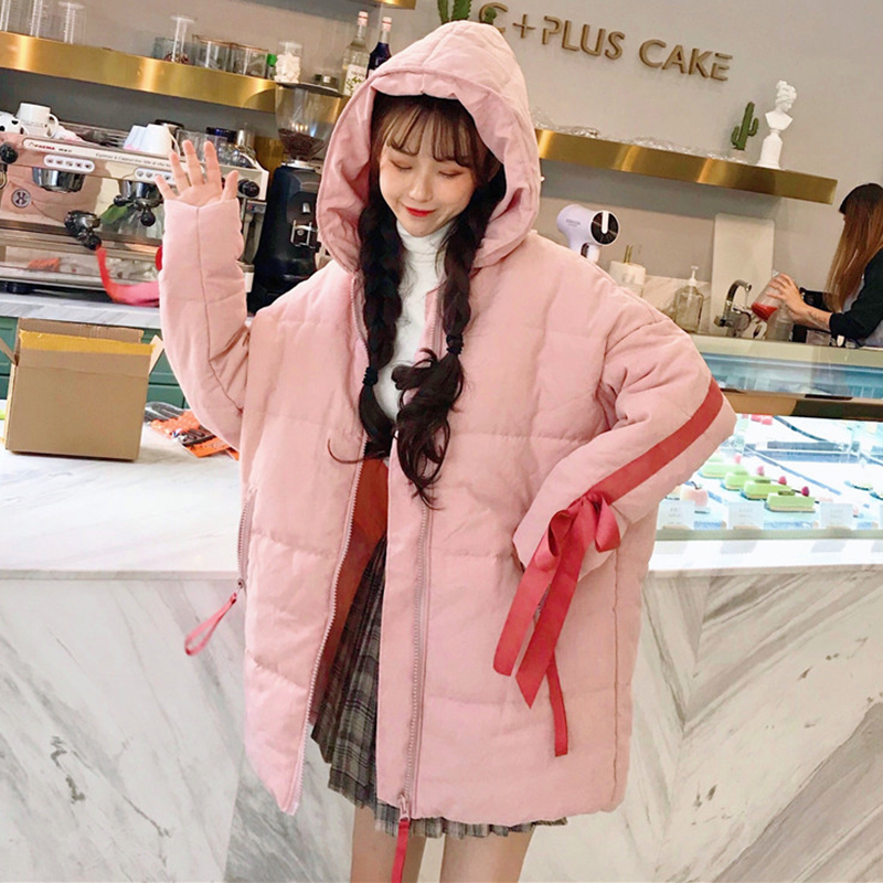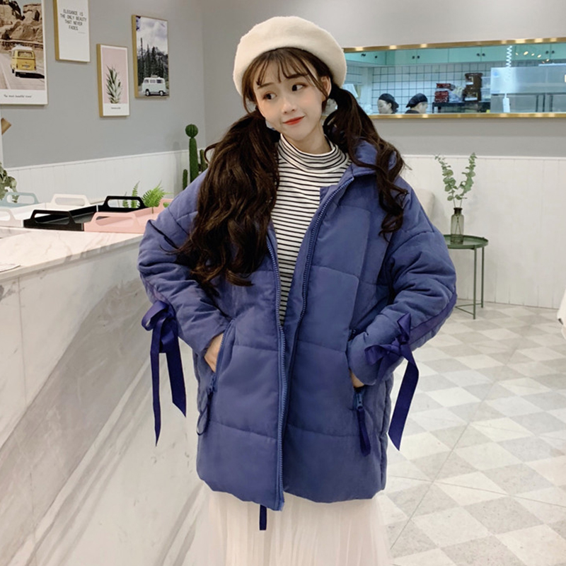 / 學院風個性絲帶棉服外套女冬裝2018新款中長款寬松加厚連帽面包服
