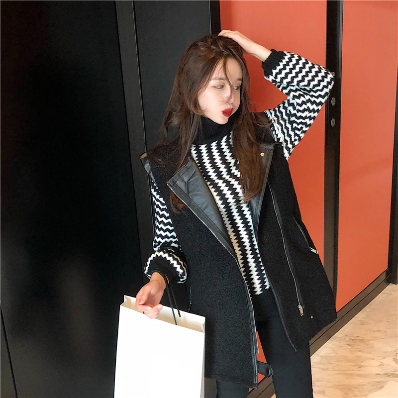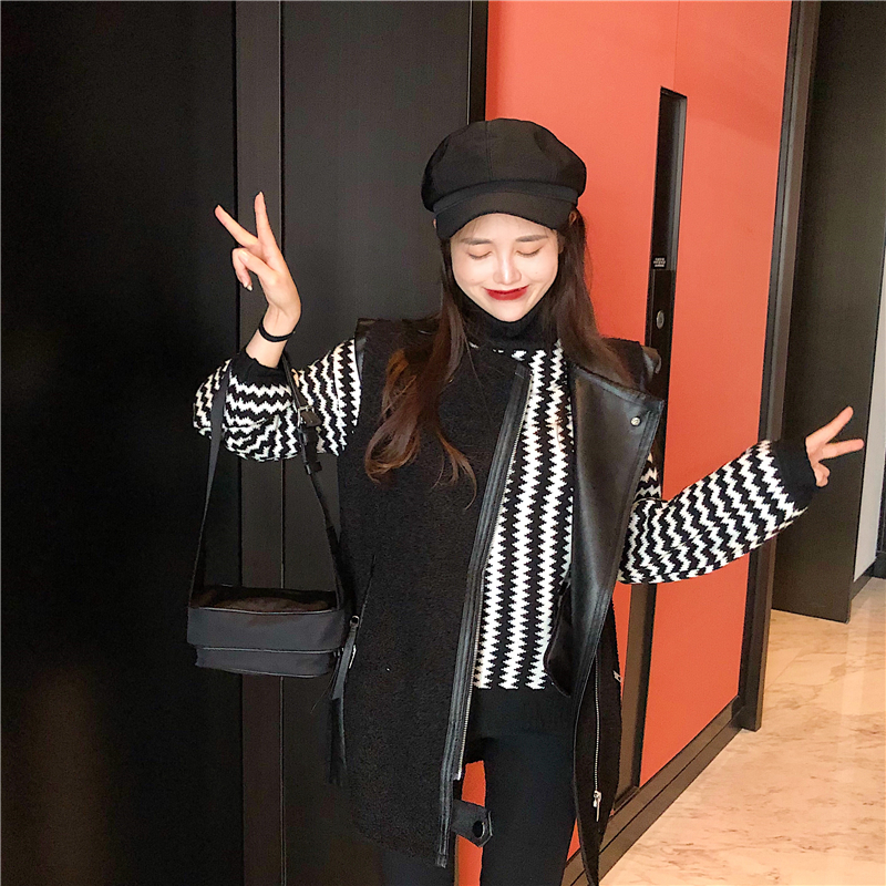 / 新款拼接中長款皮毛一體馬夾慵懶長袖條紋拼色毛衣時尚套裝兩件套