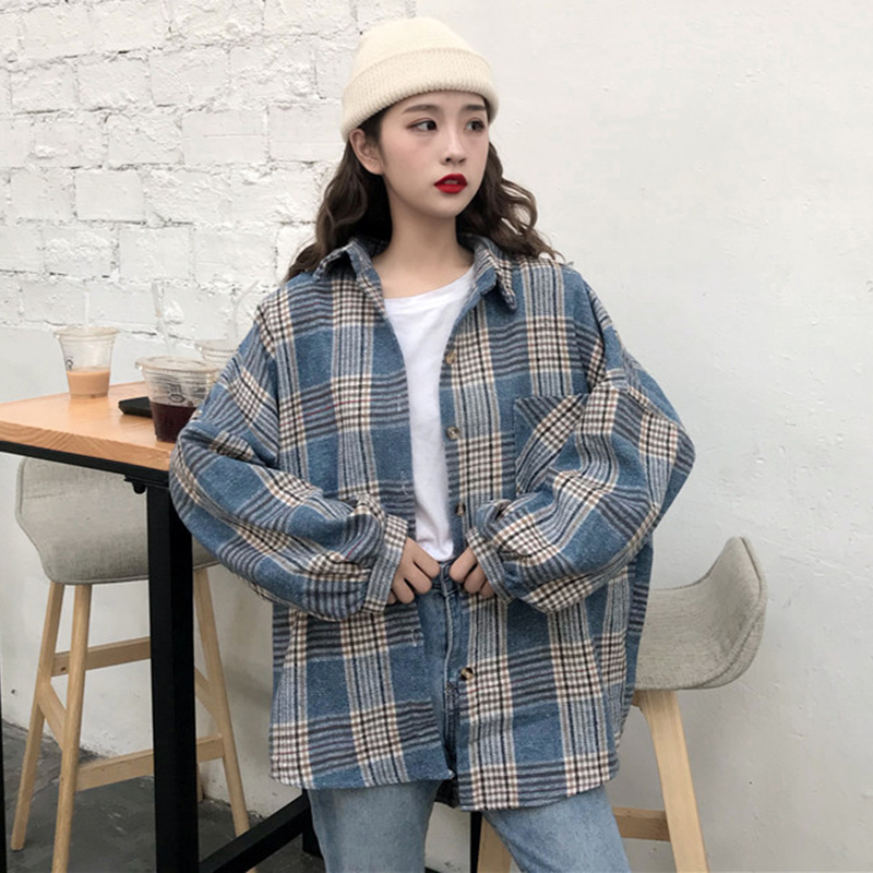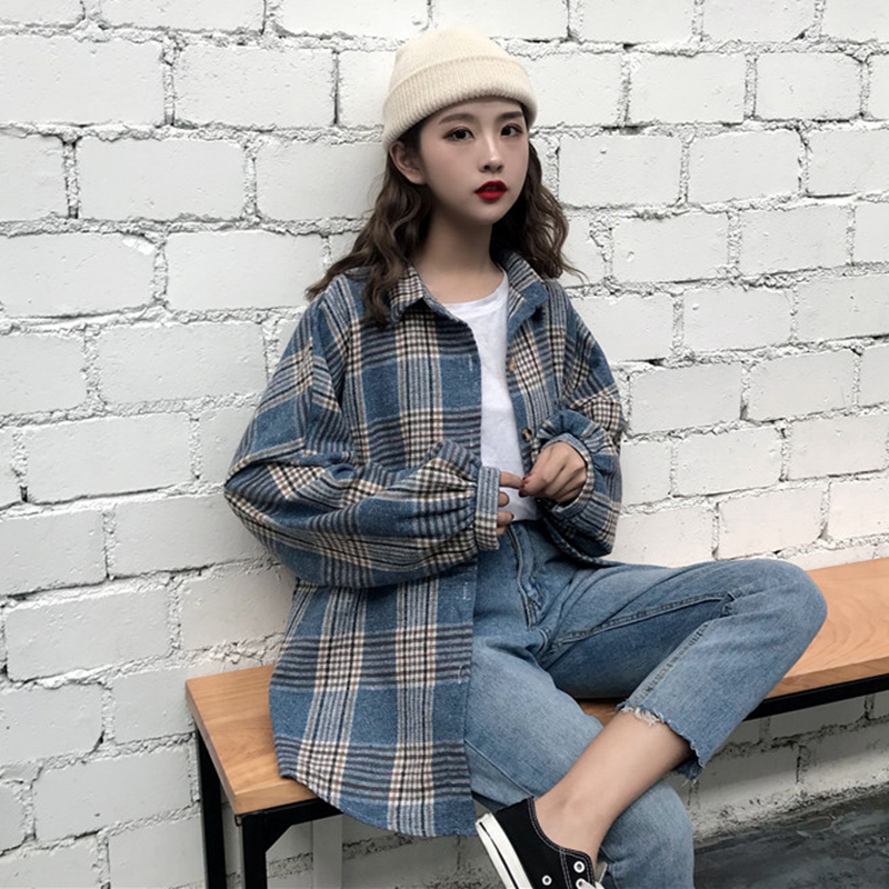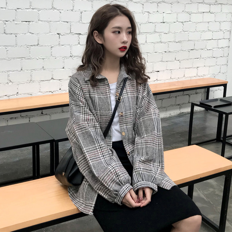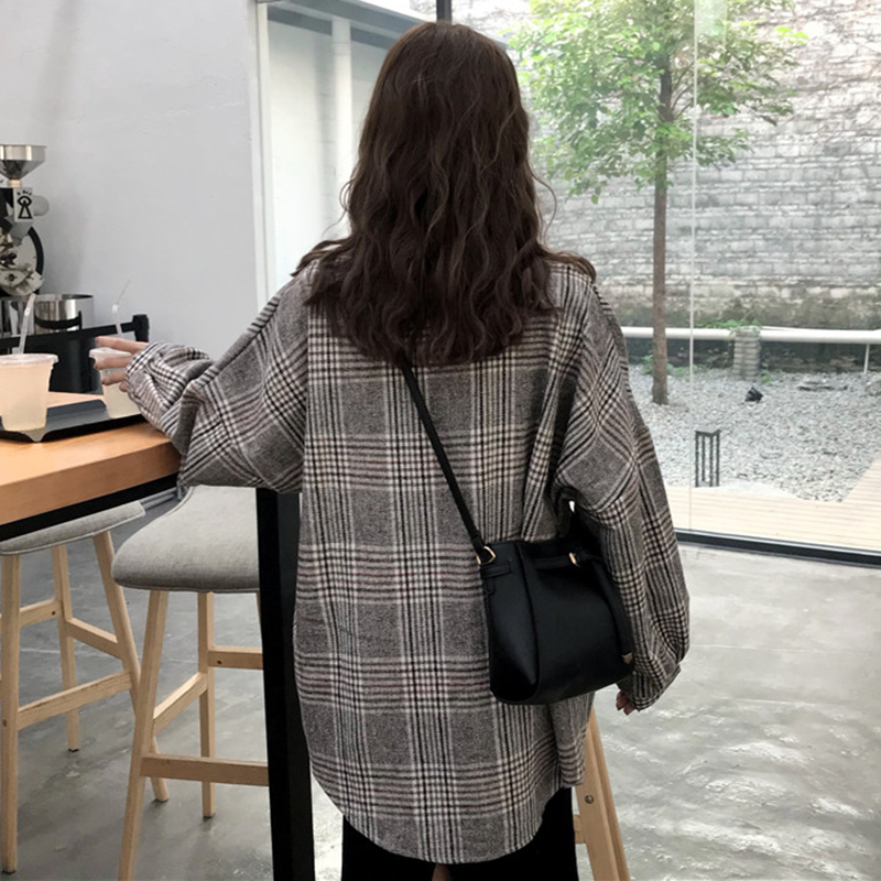/ 復古格子毛呢外套秋冬女裝2018新款寬松長袖休閑襯衫學生時尚上衣