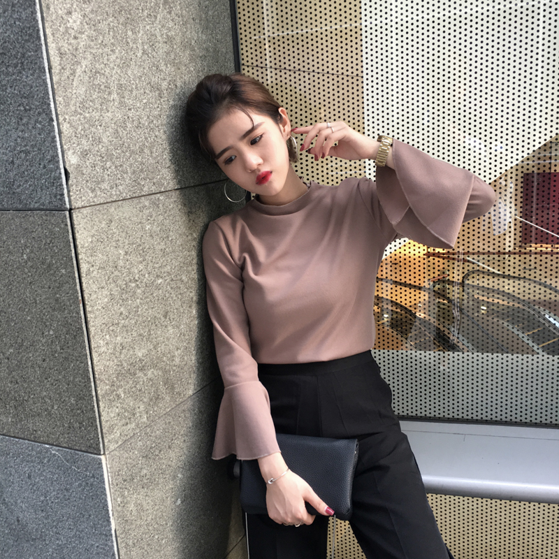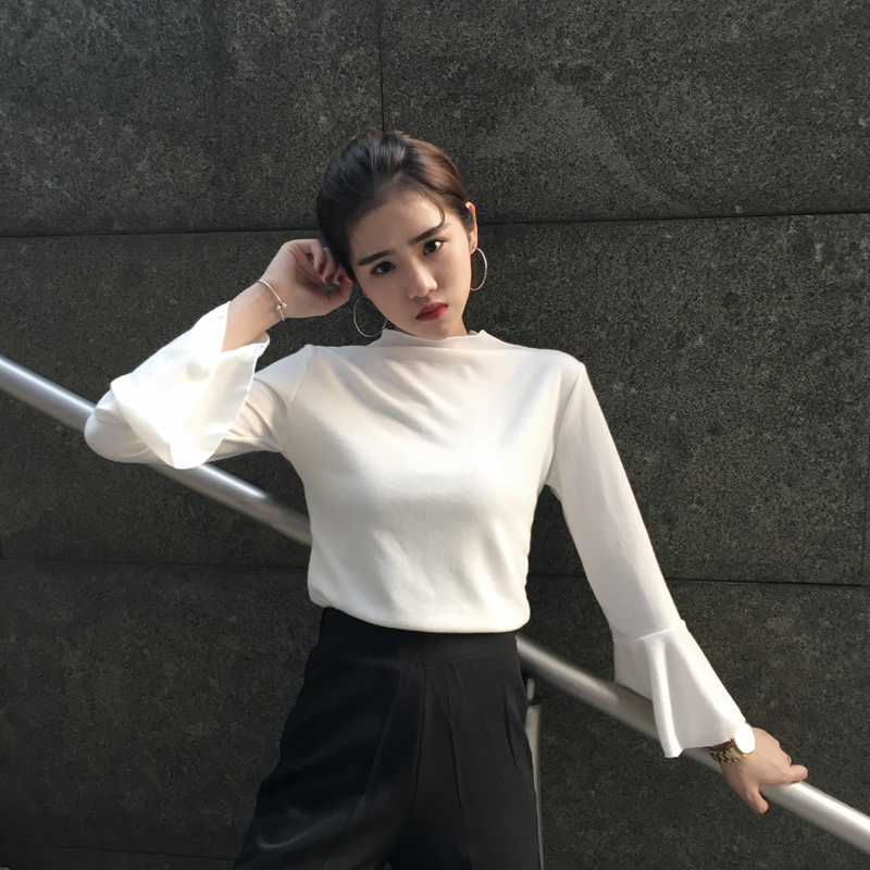 / 春夏新款長袖修身薄款百搭喇叭袖學生寬松上衣女針織打底衫t恤