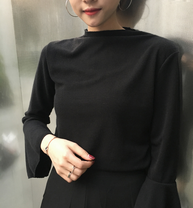 春夏新款長袖修身薄款百搭喇叭袖學生寬松上衣女針織打底衫t恤
