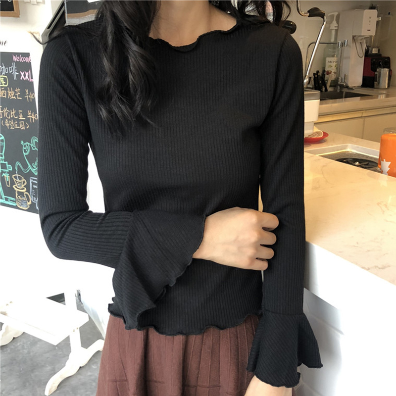 / 簡約喇叭長袖打底衫秋裝女2018新款修身純色短款上衣學生圓領T恤