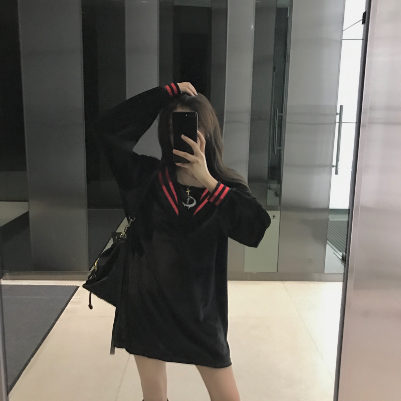 chic早秋裙子長裙女慵懶風韓版百搭寬松連帽系帶過膝長袖連衣裙潮