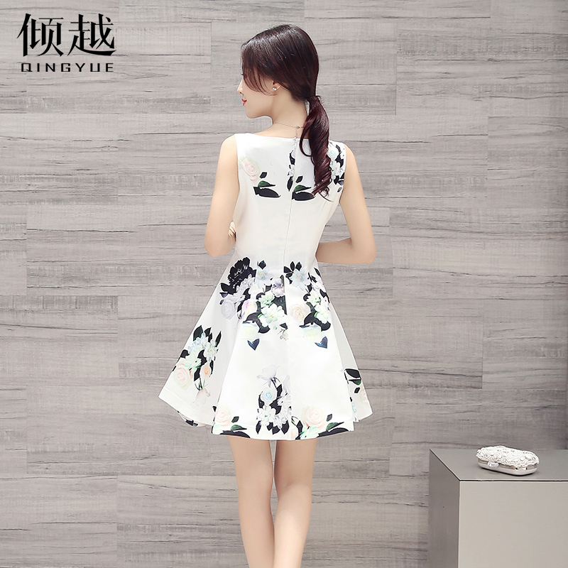 / 2017夏裝新款氣質淑女雪紡連衣裙無袖修身顯瘦束腰中長款印花裙子